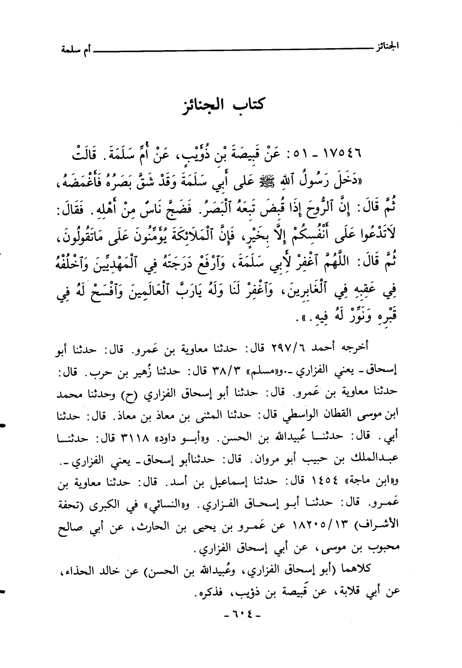 دَخَلَ رَسُولُ اللهِِ صلى الله عليه وسلم عَلى أبي سَلَمَةَ وَقَدْ شَقَّ بَصَرُهُ فَاغْمَضَهُ، ثُمَّ قَالَ: إِنَّ الرُّوحَ إِذَا قُبضَ تَبِعَهُ الْبَصَرُ. فَضَجَّ نَاسٌ مِنْ اهْلِهِ. فَقَالَ: لاتَدْعُوا عَلَى انْفُسِكُمْ إِلابِخَيْرٍ، فَإِنَّ الْمَلائِكَةَ يُؤمِّنُونَ عَلَى مَاتَقُولُونَ، ثُم قَالَ: اللَّهُمَّ اغْفِرْ لأبي سَلَمَةَ، وَارْفَعْ دَرَجَتَهُ فِي الْمَهْدِيِّينَ وَاخْلُفْهُ فِي عَقِبِهِ فِي الْغَابِرِينَ، وَاغْفِرْ لَنَا وَلَهُ يَارَبَّ الْعَالَمِينَ وَافْسَحْ لَهُ فِي قَبْرِهِ وَنَوِّرْ لَهُ فِيهِ.