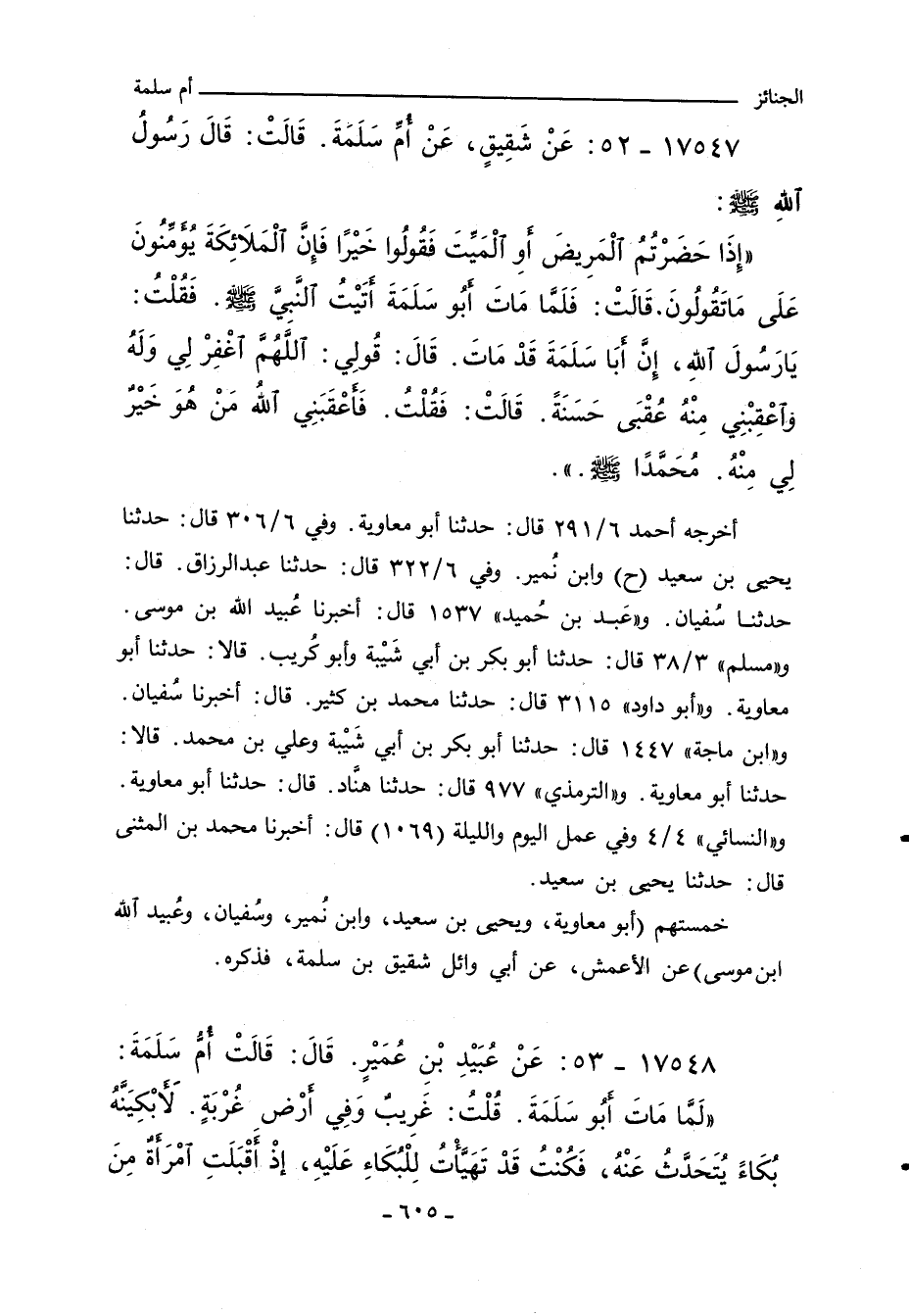 إِذَا حَضَرْتُمُ الْمَرِيضَ اوِ الْمَيِّتَ فَقُولُوا خَيْرًا فَإِنَّ الْمَلائِكَةَ يُؤمِّنُونَ عَلَى مَاتَقُولُونَ. قَالَتْ: فَلَمَّا مَاتَ أبو سَلَمَةَ اتَيْتُ النَّبيَّ صلى الله عليه وسلم. فَقُلْتُ: يَارَسُولَ اللهِِ، إِنَّ ابَا سَلَمَةَ قَدْ مَاتَ، قال: قُولِي: اللَّهُمَّ اغْفِرْ لِي وَلَهُ وَاعْقِبْنِي مِنْهُ عُقْبَى حَسَنَةً. قَالَتْ: فَقُلْتُ. فَاعْقَبَنِي اللَّهُ مَنْ هُوَ خَيْرٌ لِي مِنْهُ. مُحَمَّدًا صلى الله عليه وسلم.
