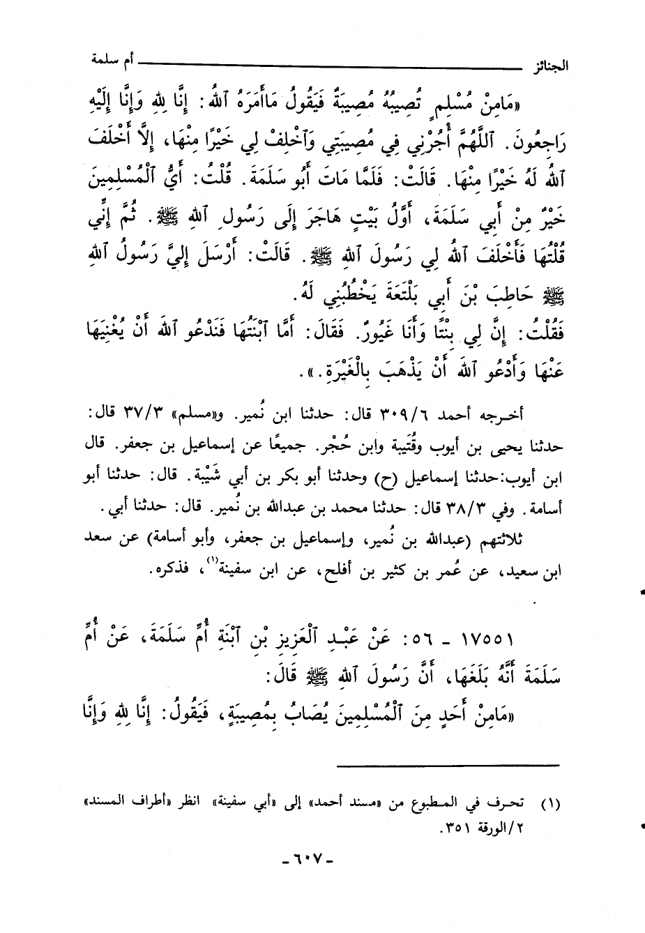 مَا مِنْ مُسْلِمٍ تُصِيبُهُ مُصِيبَةٌ فَيَقُولُ مَا امَرَهُ اللَّهُ: إِنَّا لِلَّهِ وَإِنَّا إِلَيْهِ رَاجِعُونَ. اللَّهُمَّ اْجُرْنِى فِى مُصِيبَتِى وَاخْلِفْ لِى خَيْرًا مِنْهَا، إِلَاّ اخْلَفَ اللَّهُ لَهُ خَيْرًا مِنْهَا. قَالَتْ: فَلَمَّا مَاتَ أبو سَلَمَةَ. قُلْتُ: اىُّ الْمُسْلِمِينَ خَيْرٌ مِنْ ابِى سَلَمَةَ، اوَّلُ بَيْتٍ هَاجَرَ إِلَى رَسُولِ اللَّهُ صلى الله عليه وسلم. ثُمَّ إِنِّى قُلْتُهَا فَاخْلَفَ اللَّهُ لِى رَسُولَ اللهِِ صلى الله عليه وسلم. قَالَتْ: ارْسَلَ إِلَىَّ رَسُولُ اللهِِ صلى الله عليه وسلم حَاطِبَ بْنَ ابِى بَلْتَعَةَ يَخْطُبُنِى لَهُ.
