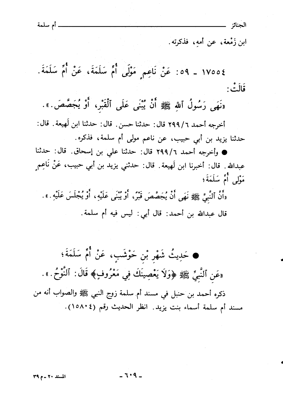 وأخرجه أحمد ٦/ ٢٩٩ قال: حدثنا علي بن إسحاق، قال: حدثنا عبد الله، قال: أخبرنا ابن لَهيعة، قال: حدثني يزيد بن أبي حبيب، عَنْ نَاعِمٍ مَوْلى أم سَلَمَةَ؛ أَنَّ النَّبِيَّ صلى الله عليه وسلم نَهَى أَنْ يُجَصًّصَ قَبْرٌ، اوْ يُبْنَى عَلَيْهِ، اوْ يُجْلَسَ عَلَيْهِ.