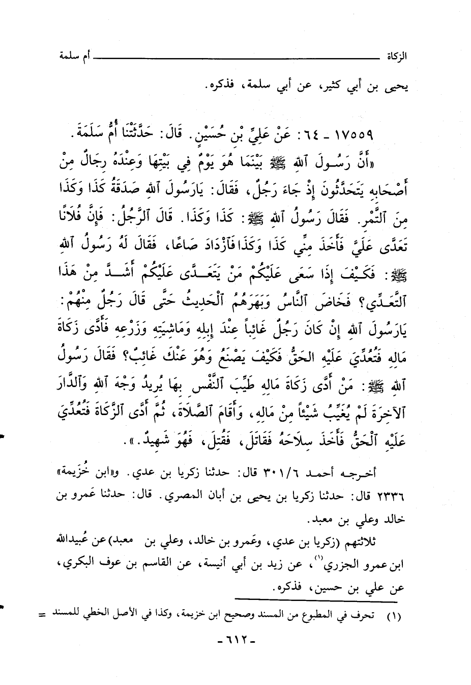 أَنَّ رَسُولَ اللهِِ صلى الله عليه وسلم بَيْنَمَا هُوَ يَوْمٌ فِي بَيْتِهَا وَعِنْدَهُ رِجَالٌ مِنْ اصْحَابهِ يَتَحَدَّثُونَ إِذْ جَاءَ رَجُلٌ، فَقَالَ: يَارَسُولَ اللهِِ صَدَقَةُ كَذَا وَكَذَا مِنَ التًّمْرِ. فَقَالَ رَسُولُ اللهِِ صلى الله عليه وسلم: كَذَا وَكَذَا، قال الرَّجُلُ: فَإِنَّ فُلانًا تَعَدَّى عَلَيَّ فَاخَذَ مِنِّي كَذَا وَكَذَا فَازْدَادَ صَاعًا، فَقَالَ لَهُ رَسُولُ اللهِِ صلى الله عليه وسلم: فَكَيْفَ إِذَا سَعَى عَلَيْكُمْ مَنْ يَتَعَدَّى عَلَيْكُمْ اشَدَّ مِنْ هَذَا التَّعَدِّي؟ فَخَاضَ النَّاسُ وَبَهَرَهُمُ الْحَدِيثُ حَتَّى قَالَ رَجُلٌ مِنْهُمْ: يَارَسُولَ اللهِِ إِنْ كَانَ رَجُلٌ غَائِبًا عِنْدَ إِبِلِهِ وَمَاشِيَتِهِ وَزَرْعِهِ فَادَّى زَكاةَ مَالِهِ فَتُعُدِّيَ عَلَيْهِ الحَقُّ فَكَيْفَ يَصْنَعُ وَهُوَ عَنْكَ غَائِبٌ؟ فَقَالَ رَسُولُ اللهِِ صلى الله عليه وسلم: مَنْ ادَّى زَكَاةَ مَالِهِ طَيِّبَ النَّفْسِ بِهَا يُرِيدُ وَجْهَ الله وَالدَّارَ الاخِرَةَ لَمْ يُغَيِّبُ شَيْئًا مِنْ مَالِهِ، وَاقَامَ الصَّلاةَ، ثُمَّ ادَّى الزَّكَاةَ فَتُعُدِّيَ عَلَيْهِ الْحَقُّ فَاخَذَ سِلاحَهُ فَقَاتَلَ، فَقُتِلَ، فَهُوَ شَهِيدٌ.