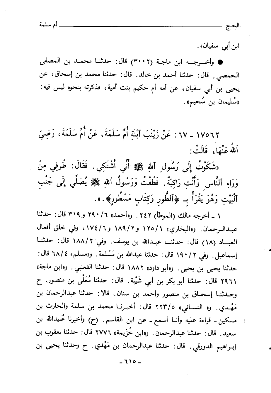١٧٥٦٢ - عَنْ زَيْنَبَ ابْنَةِ أم سَلَمَةَ، عَنْ أم سَلَمَةَ، رَضِيَ اللَّهُ عَنْهَا، قَالَتْ: شَكَوْتُ إِلَى رَسُولِ اللهِ صلى الله عليه وسلم انِّي اشْتَكِي. فَقَالَ: طُوفِي مِنْ وَرَاءِ النَّاسِ وَانْتِ رَاكِبَةٌ. فَطُفْتُ وَرَسُولُ اللهِِ صلى الله عليه وسلم يُصَلِّي إِلَى جَنْبِ الْبَيْتِ وَهُوَ يَقْرَاُ بِـ: (الطُّورِ وَكِتَابٍ مَسْطُورٍ).