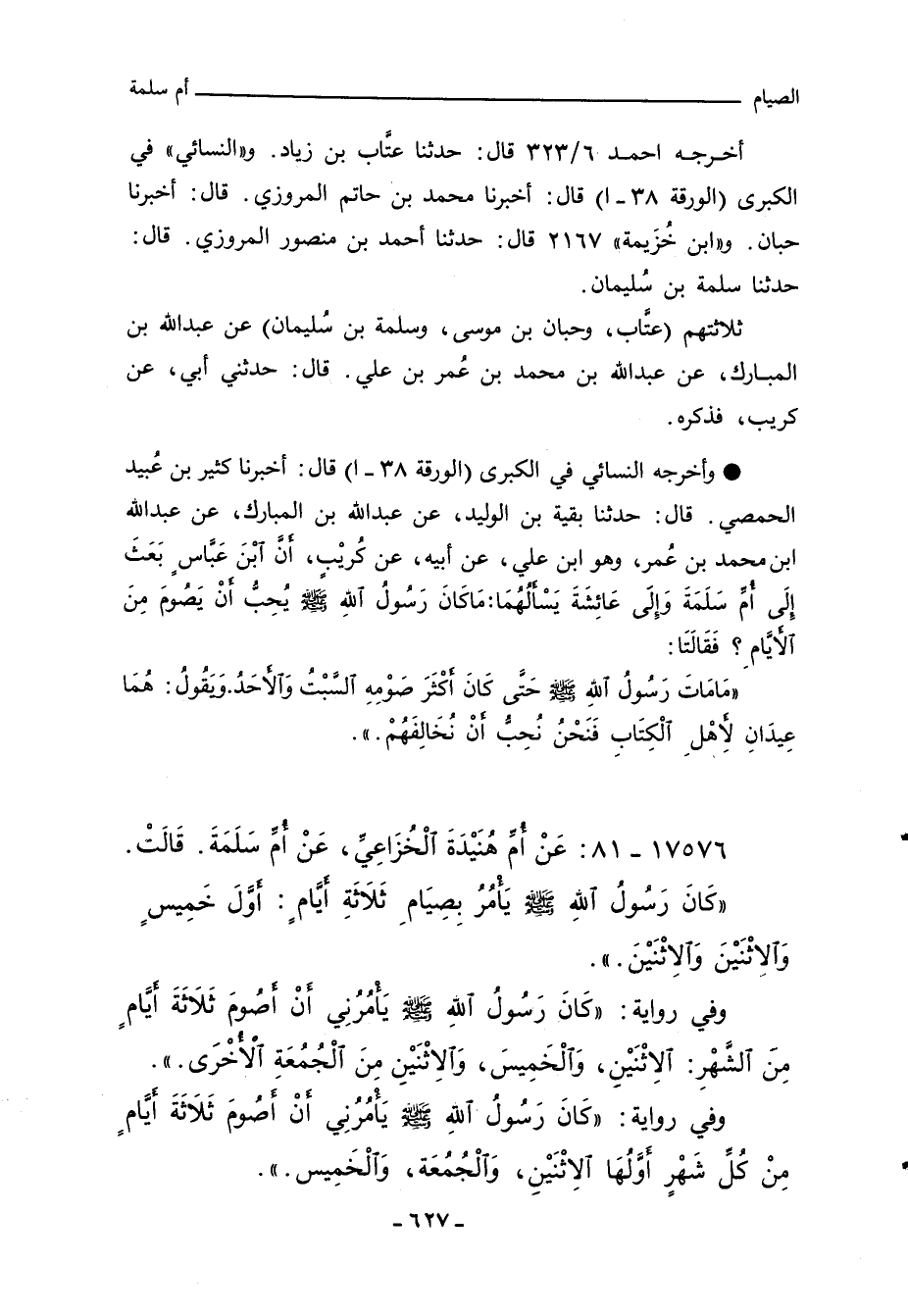 - وأخرجه النسائي في "الكبرى" (الورقة ٣٨ - ا) قال: أخبرنا كثير بن عُبيد الحمصي، قال: حدثنا بقية بن الوليد، عن عبد الله بن المبارك، عن عبد الله بن محمد بن عُمر، وهو ابن علي، عن أبيه، عن كُريْبِ، أَنَّ ابْنَ عَبَّاسٍ بَعَثَ إِلَى أم سَلَمَةَ وَإِلَى عَائِشَةَ يَسْالُهُمَا: مَاكَانَ رَسُولُ اللهِِ صلى الله عليه وسلم يُحبُّ أَنْ يَصُومَ منَ الايَّامِ؟ فَقَالَتَا:
