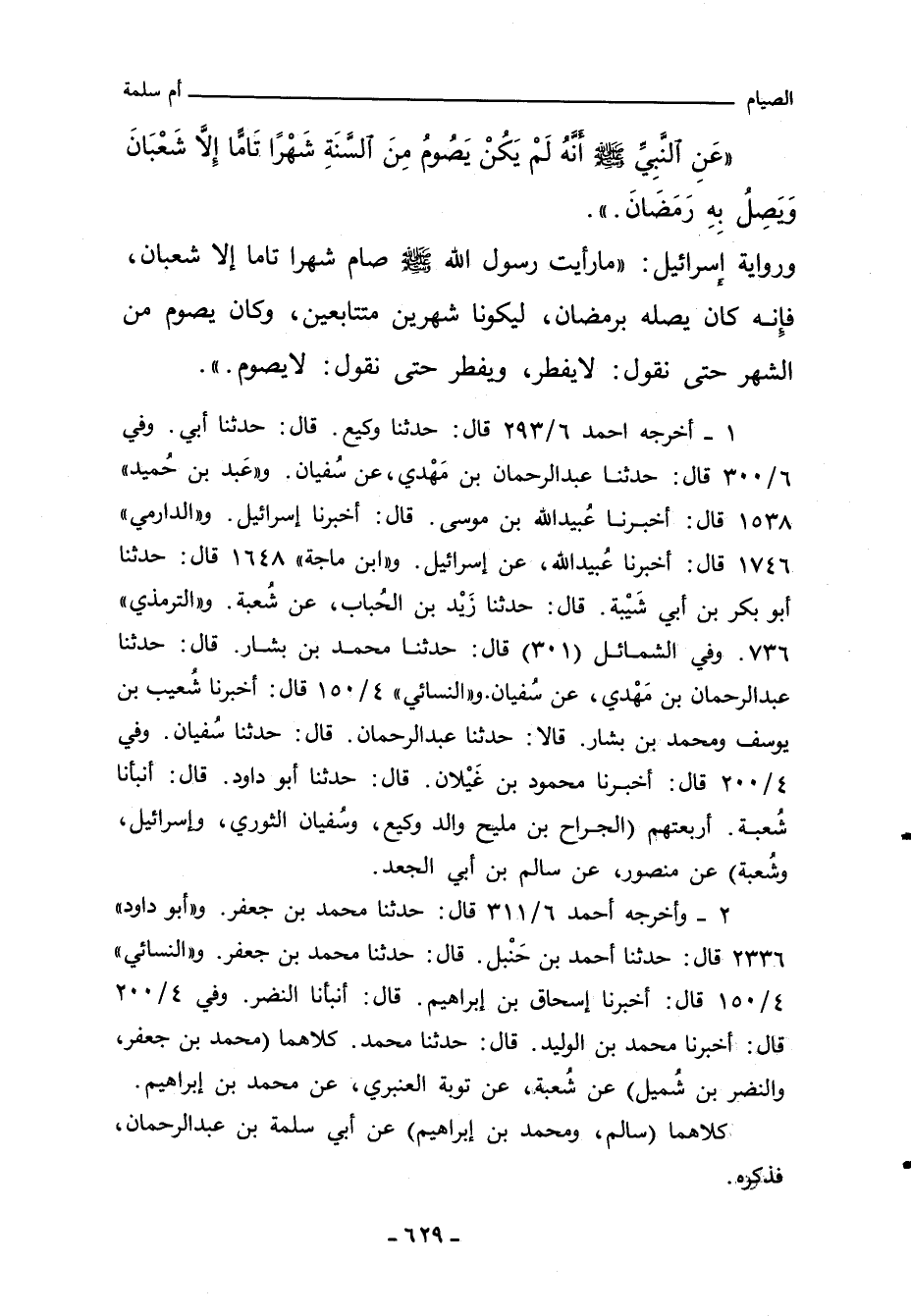 ورواية اسرائيل: مارَاْيِتُ رَسُولِ اللهِ صلى الله عليه وسلم صَامَ شَهْرًَا تَامًَا الَاّ شَعْبَان، فَإِنَّهُ كَانَ يَصِلْهُ بِرَمْضَان، لِيَكُونَا شَهْرَيْنِ مُتَتَابِعَيِنِ، وَكَانَ يَصُومُ مِنَ الشَّهْرِ حَتَّى نَقُولُ: لايُفْطِرُ، وَيُفْطِرُ حَتَّى نَقُولُ: لايَصُومُ.