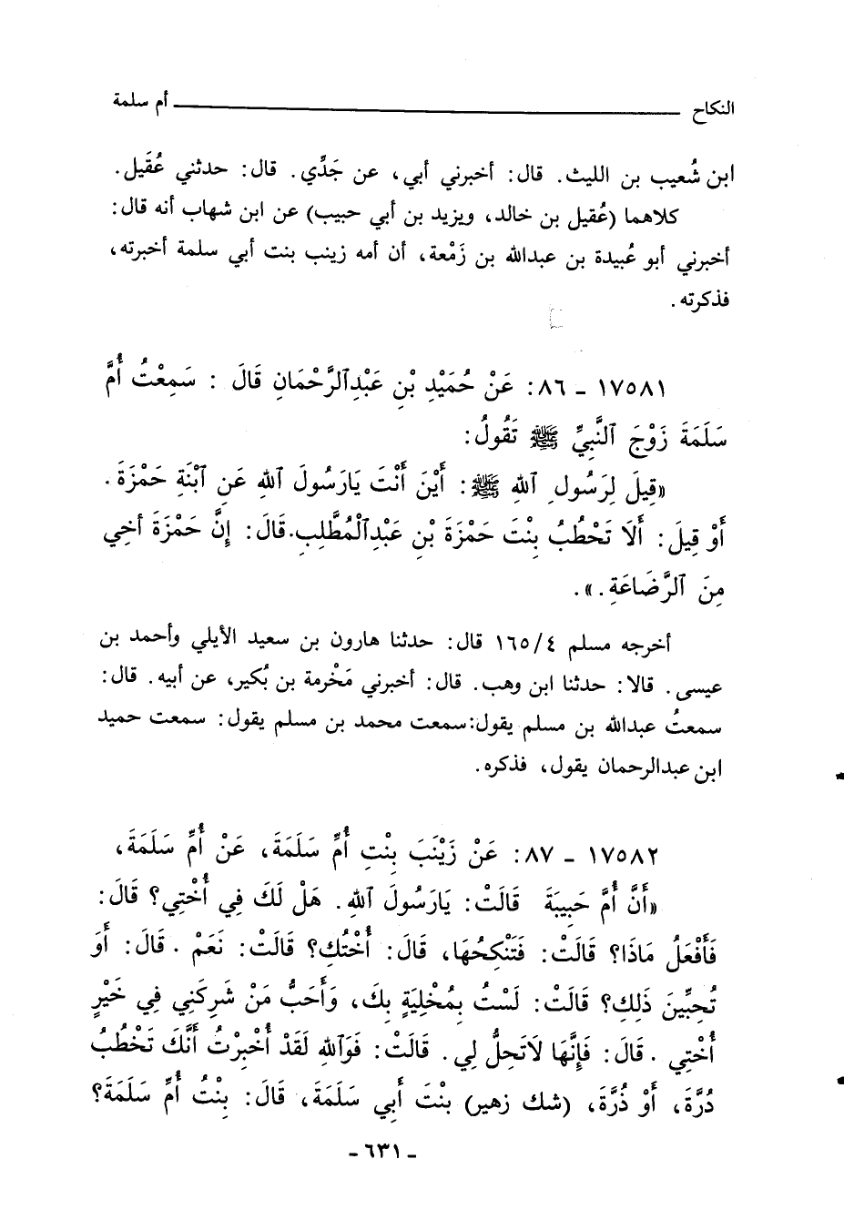 أَنَّ أم حَبِيبَةَ قَالَتْ: يَا رَسُولَ اللهِِ. هَلْ لَكَ فِى اُخْتِى؟ قَالَ: فَافْعَلُ مَاذَا؟ قَالَتْ: فَتَنْكِحُهَا، قال: اُخْتَكِ؟ قَالَتْ: نَعَمْ، قال: اوَتُحِبِّينَ ذَاكَ؟ قَالَتْ: لَسْتُ بِمُخْلِيَةٍ بِكَ، وَاحَبُّ مَنْ شَرَكَنِى فِى خَيْرٍ اُخْتِى، قال: فَإِنَّهَا لا تَحِلُّ لِى. قَالَتْ: فَوَاللَّهِ لَقَدْ اُخْبِرْتُ انَّكَ تَخْطُبُ دُرَّةَ، اوْ ذَرَّةَ (شَكَّ زُهَيْرٌ) بِنْتَ ابِى سَلَمَةَ، قال: بِنْتَ أم سَلَمَةَ؟