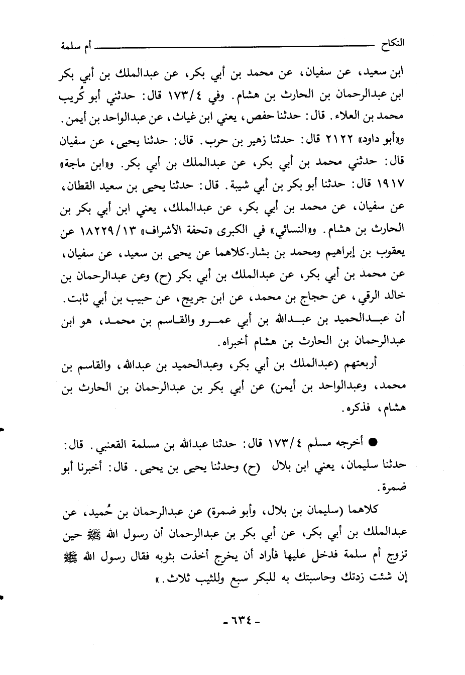 كلاهما (سليمان بن بلال، وأبو ضمرة) عن عبد الرحمن بن حُميد، عن عبد الملك بن أبي بكر، عن أبي بكر بن عبد الرحمن ان رسول الله صلى الله عليه وسلم حين تزوج أم سلمة فدخل عليها فاراد ان يخرج اخذت بثوبه فقال رسول الله صلى الله عليه وسلم ان شئت زدتك وحاسبتك به للبكر سبع وللثيب ثلاث.