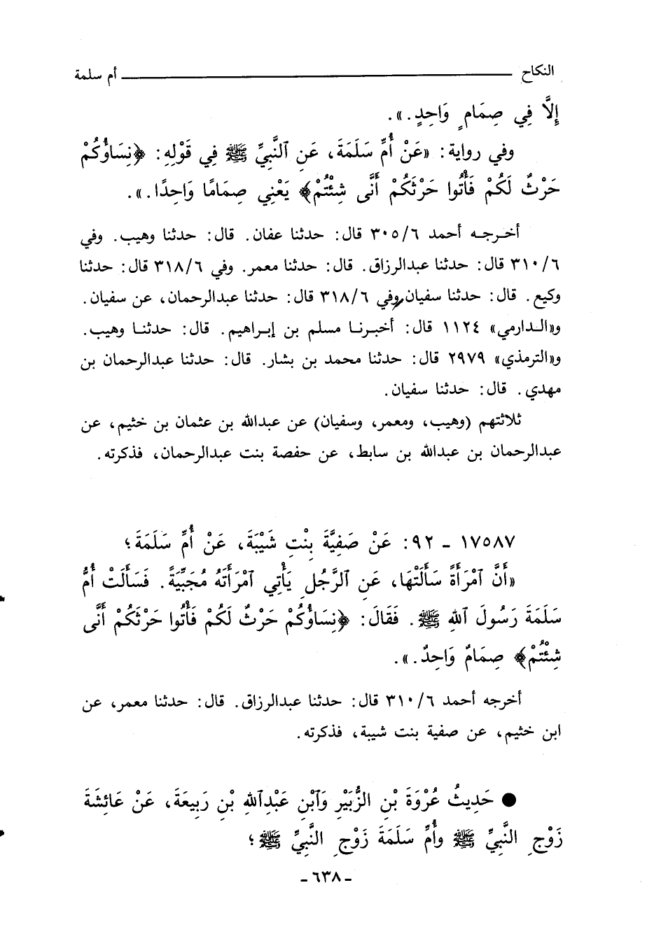 أَنَّ امْراةً سَالَتْهَا، عَنِ الرَّجُلِ يَاتِي امْراتَهُ مُجَبِّيَةً. فَسَالَتْ أم سَلَمَةَ رَسُولَ اللهِِ صلى الله عليه وسلم. فَقَالَ: (نِسَاؤُكْم حَرْثٌ لَكُمْ فَاتُوا حَرْثَكُمْ انَّى شِئْتًمْ) صِمَامٌ وَاحِدٌ.