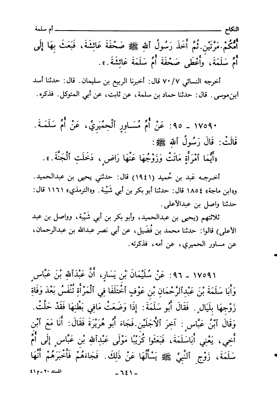 ١٧٥٩٠ - عَنْ أم مُسَاوِرٍ الْحِمْيَرِيِّ، عَنْ أم سَلَمَةَ. قَالَتْ: قَالَ رَسُولُ اللهِِ صلى الله عليه وسلم: ايُّمَا امْرَاةٍ مَاتَتْ وَزَوْجُهَا عَنْهَا رَاضٍ، دَخَلَتِ الْجَنَّةَ.