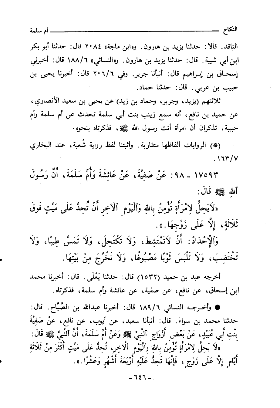 - وأخرجه النسائي ٦/ ١٨٩ قال: أخبرنا عبد الله بن الصَّبَاح، قال: حدثنا محمد بن سواء، قال: أنبأنا سعيد، عن أيوب، عن نافع، عنْ صَفِيَّةَ بنْتِ أبي عُبَيْدٍ، عَنْ بَعْضِ ازْوَاجِ النَّبِيِّ صلى الله عليه وسلم وَعَنْ أم سَلَمَةَ، أَنَّ النَّبيَّ صلى الله عليه وسلم قَالَ: