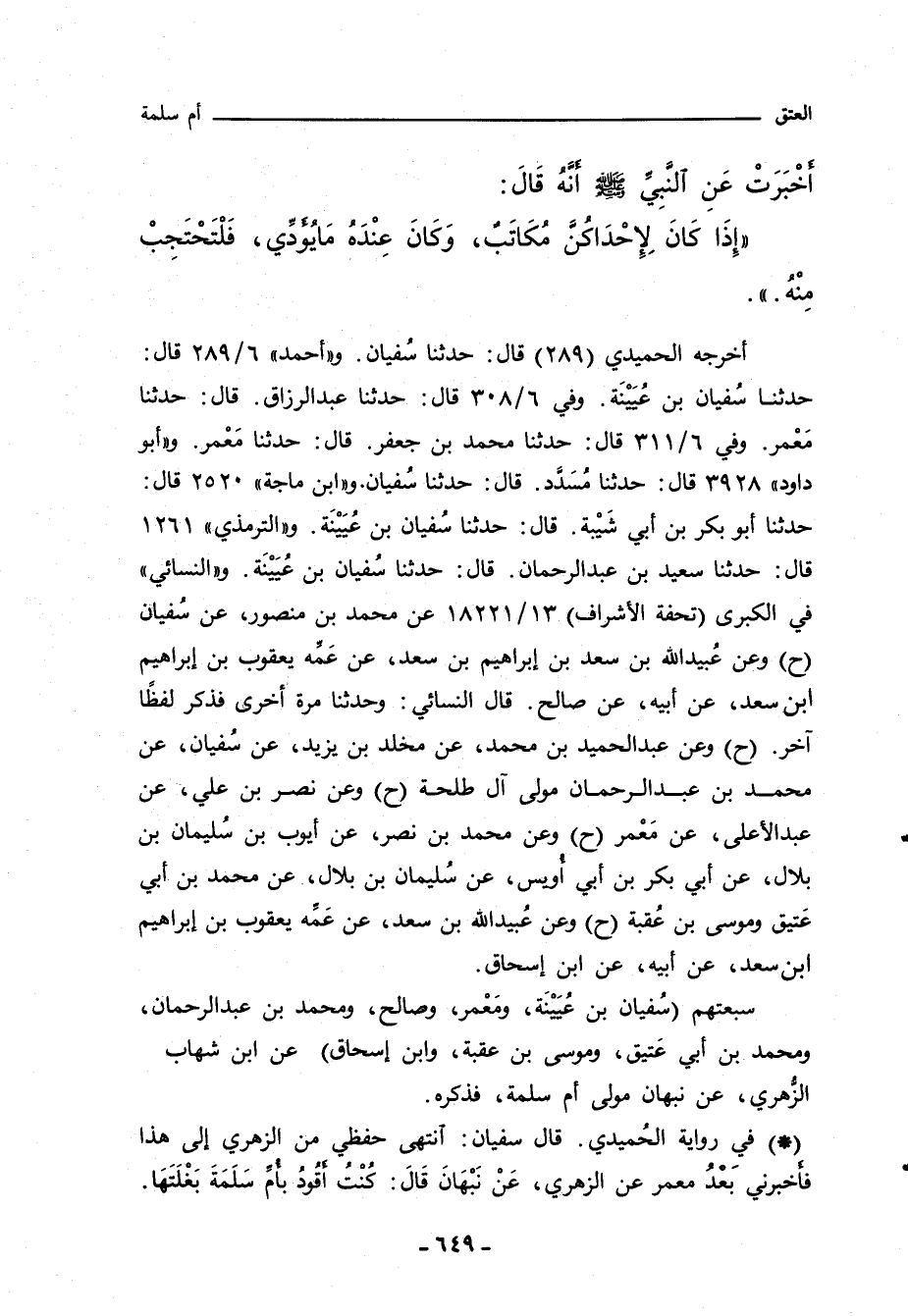 - في رواية الحُميدي، قال سُفْيَانُ: انْتَهَى حِفْظِى مِنَ الزُّهْرِىِّ إِلَى هَذَا فَاخْبَرَنِى بَعْدُ مَعْمَرٌعَنِ الزُّهْرِىِّ، عَنْ نَبْهَانَ قَالَ: كُنْتُ اقُودُ بِاُمِّ سَلَمَةَ بَغْلَتَهَا.