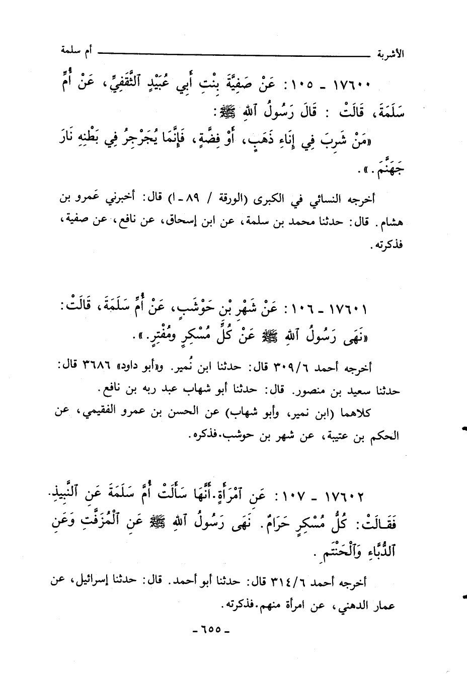 ١٧٦٠٢ - عَنِ امْرَاةٍ. انَّهَا سَالَتْ أم سَلَمَةَ عَنِ النَّبِيذِ. فَقَالَتْ: كُلُّ مُسْكِرٍ حَرَامٌ. نَهَى رَسُولُ اللهِِ صلى الله عليه وسلم عَنِ الْمُزَفَّتِ وَعَنِ الدُّبَّاءِ وَالْحَنْتَمَ.