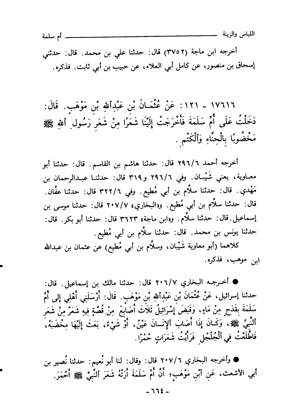١٧٦١٦ - عَنْ عُثْمَانَ بْنِ عَبْدِ اللهِ بْنِ مَوْهَبٍ، قال: دَخَلْتُ عَلَى أم سَلَمَةَ فَاخْرَجَتْ إِلَيْنَا شَعَرًا مِنْ شَعَر رَسُول اللهِ صلى الله عليه وسلم مَخْضُوبًا بِالْحِنَّاءِ وَالْكَتْمِ.