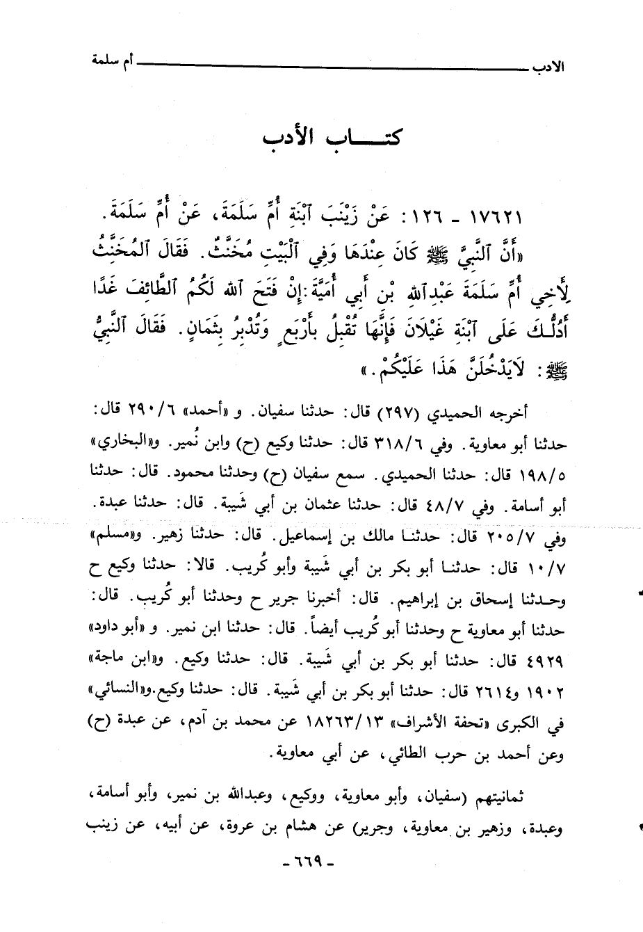 ثمانيتهم (سفيان، وأبو معاوية، ووكيع، وعبد الله بن نمير، وأبو أُسامة، وعبدة، وزهير بن معاوية، وجريج) عن هشام بن عروة، عن أبيه، عن زينب