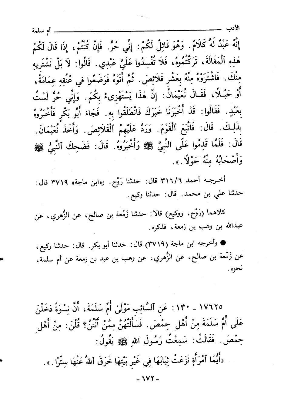 - وأخرجه ابن ماجة (٣٧١٩) قال: حدثنا أبو بكر، قال: حدثنا وكيع، عن زَمْعة بن صالح، عن الزُّهري، عن وهب بن عبد بن زمعة عن أم سلمة، نحوه.