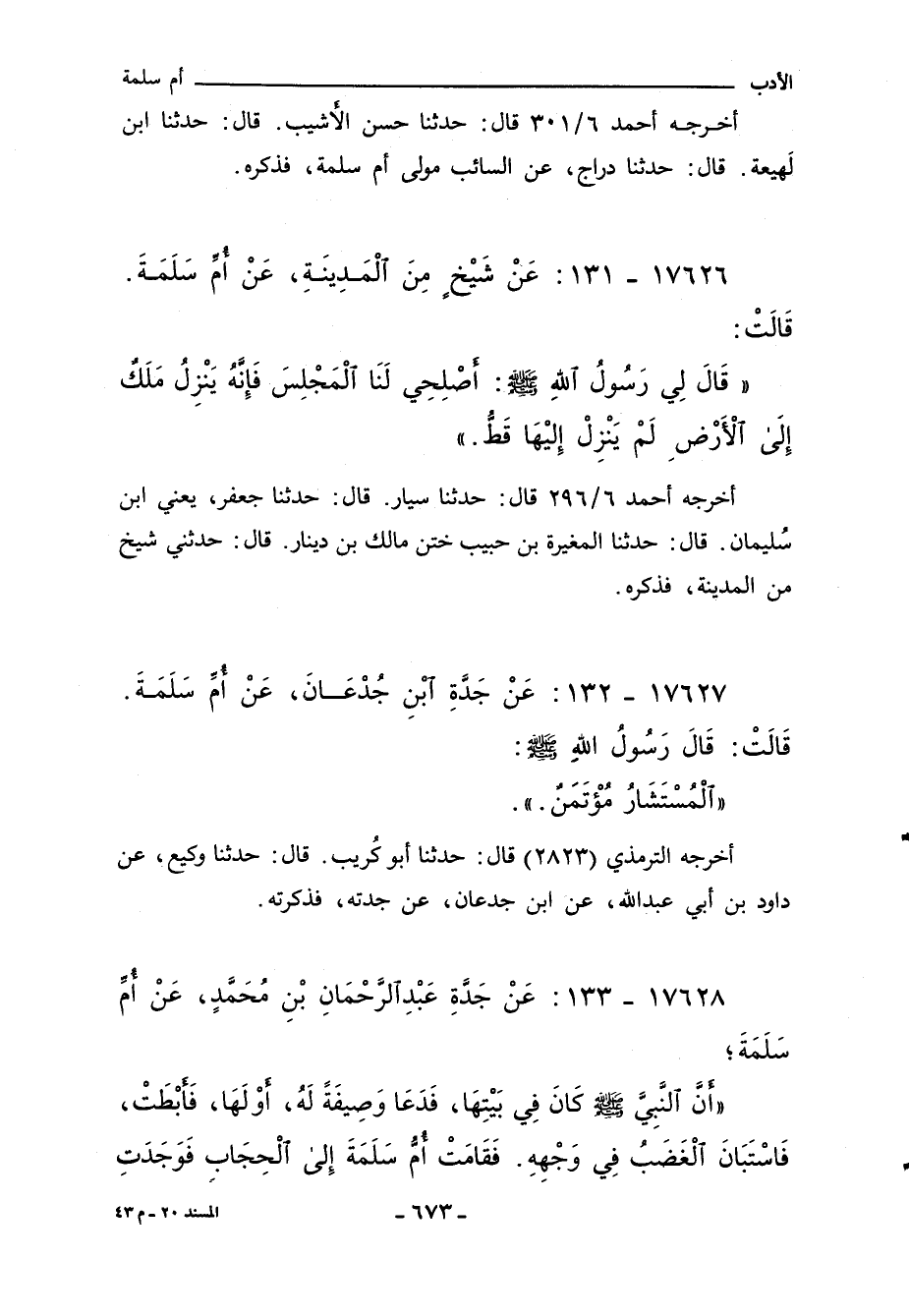 ١٧٦٢٨ - عَنْ جَدَّةِ عَبْدِ الرَّحْمانِ بْنِ مُحَمَّدٍ، عَنْ أم سَلَمَةَ؛
