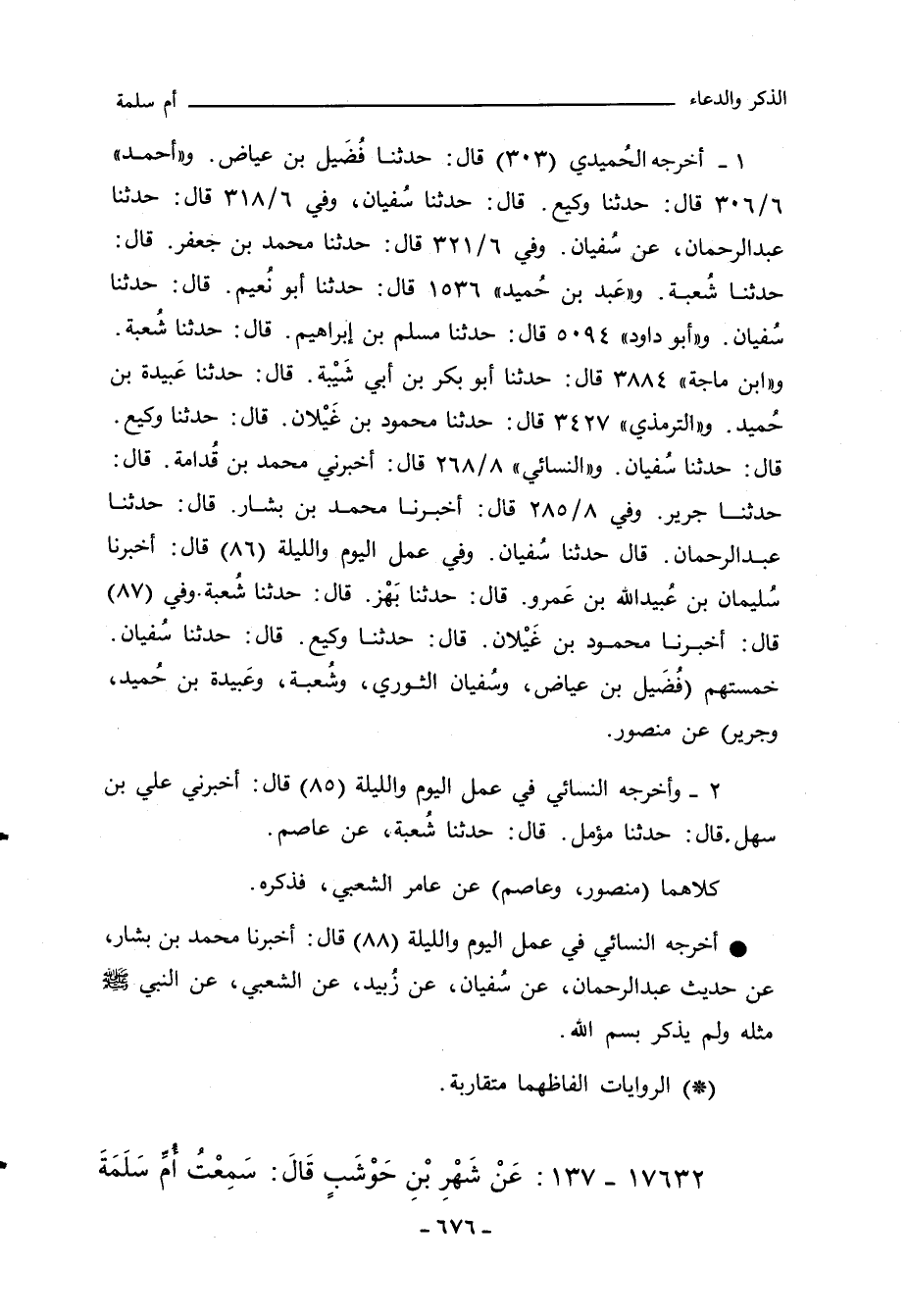 ١ - أخرجه الحُميدي (٣٠٣) قال: حدثنا فضيل بن عياض. و"أحمد" ٦/ ٣٠٦ قال: حدثنا وكيع، قال: حدثنا سُفيان، وفي ٦/ ٣١٨ قال: حدثنا عبد الرحمن، عن سُفان. وفي ٦/ ٣٢١ قال: حدثنا محمد بن جعفر، قال: حدثنا شعبة. وعَبد بن حُميد ١٥٣٦ قال: حدثنا أبو نُعيم، قال: حدثنا سفيان. و"أبو داود" ٥٠٩٤ قال: حدثنا مسلم بن إبراهيم، قال: حدثنا شُعبة. و"ابن ماجة" ٣٨٨٤ قال: حدثنا أبو بكر بن أبي شَيْبة، قال: حدثنا عَبيدة بن حُميد. و"التِّرمِذي" ٣٤٢٧ قال: حدثنا محمود بن غَيْلان، قال: حدثنا وكيع، قال: حدثنا سُفيان. و"النَّسائي" ٨/ ٢٦٨ قال: أخبرني محمد بن قدامة، قال: حدثنا جرير. وفي ٨/ ٢٨٥ قال: أخبرنا محمد بن بشار، قال: حدثنا عبد الرحمن، قال حدثنا سُفيان. وفي عمل اليوم والليلة (٨٦) قال: أخبرنا سُليمان بن عُبيد الله بن عَمرو، قال: حدثنا بَهْز، قال: حدثنا شُعبة. وفي (٨٧) قال: أخبرنا محمود بن غَيْلان، قال: حدثنا وكيع، قال: حدثنا سُفيان.