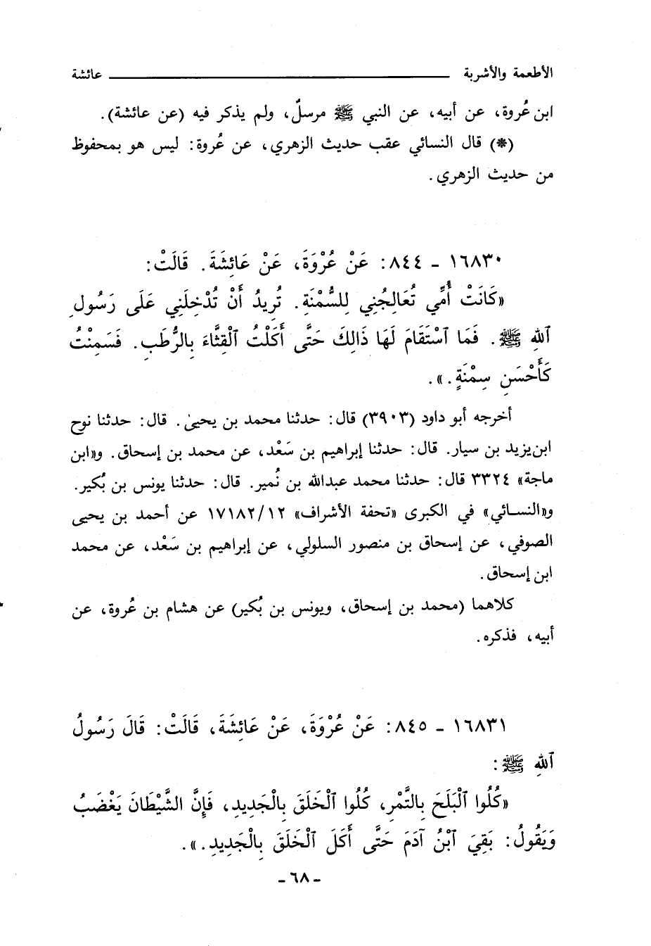 ١٦٨٣٠ - عَنْ عُرْوَةَ، عَنْ عَائِشَةَ. قَالَتْ: