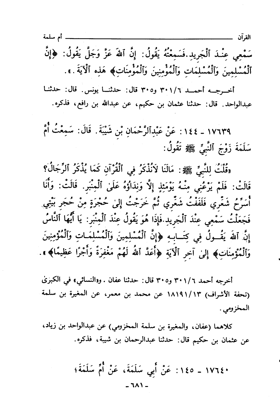 قُلْتُ لِلنَّبِيِّ صلى الله عليه وسلم: مَالَنَا لانُذْكَرُ فِي الْقُرْانِ كَمَا يُذْكَرُ الرِّجَالُ؟ قَالَتْ: فَلَمْ يَرْعُنِي مِنْهُ يَوْمَئِذٍ إِلا وَنِدَاؤُهُ عَلَى الْمِنْبَرِ. قَالَتْ: وَانَا اُسَرِّحُ شَعرِي فَلَفَفْتُ شَعرِي ثُمَّ خَرَجْتُ إِلى حُجْرَةٍ مِنْ حُجَرِ بَيْتِي فَجَعَلْتُ سَمْعِي عِنْدَ الْجَرِيدِ. فَإِذَا هُوَ يَقُولُ عِنْدَ الْمِنْبَرِ: يَا أَيُّهَا النَاسُ إِنَّ اللَّهَ يَقُولُ فِي كِتَابِهِ: (إِنَّ الْمُسْلِمِينَ وَالْمُسْلِمَاتِ وَالْمُؤْمِنِينَ وَالْمُؤْمِنَاتِ) إِلى اخِرِ الايَةِ: (اعَدَّ اللَّهُ لَهُمْ مَغْفِرَةً وَاجْرًا عَظِيمًا).