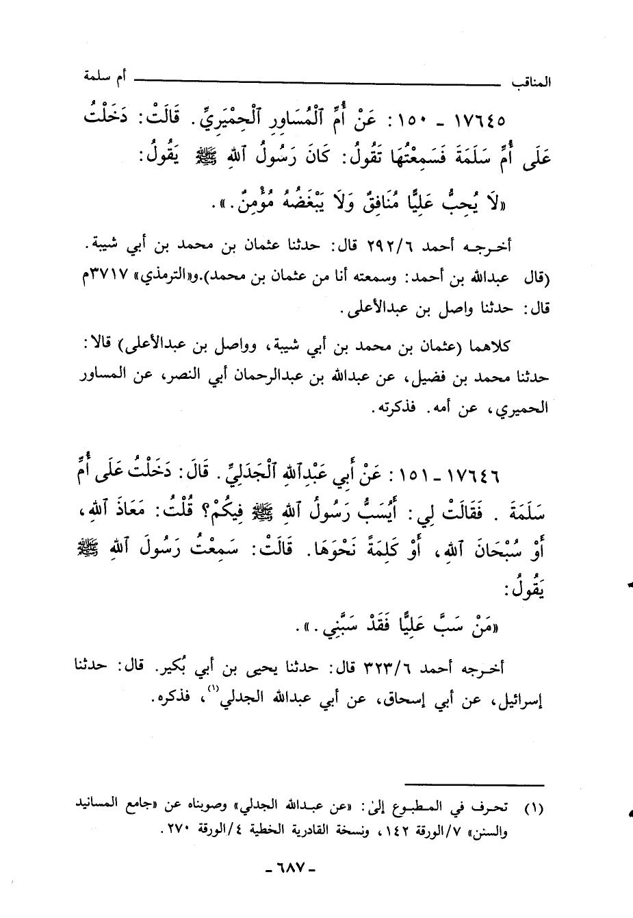 أخرجه أحمد ٦/ ٢٩٢ قال: حدثنا عثمان بن محمد بن أبي شيبة (قال عَبد اللهِ بن أحمد: وسمعته انا من عثمان بن محمد). و"التِّرمِذي" ٣٧١٧ م قال: حدثنا واصل بن عبد الاعلى.