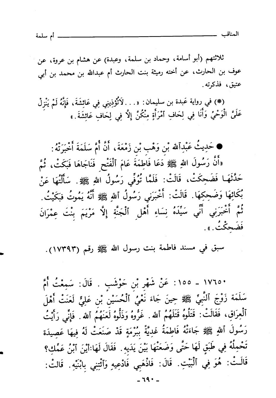 ١٧٦٥٠ - عَنْ شَهْرِ بْنِ حَوْشَبٍ، قال: سَمِعْتُ أم سَلَمَة زَوْجَ النَّبِيِّ صلى الله عليه وسلم حِينَ جَاءَ نَعْىُ الْحُسَيْنِ بْنِ عَلِىٍّ لَعَنَتْ اهْلَ الْعِرَاقِ، فَقَالَتْ: قَتَلُوهُ قَتَلَهُمُ اللَّهُ. غَرُّوهُ وَذَلُّوهُ لَعَنَهُمُ اللَّهُ. فَإِنِّى رَايْتُ رَسُولَ اللهِِ صلى الله عليه وسلم جَاءَتْهُ فَاطِمَةُ غَدِيَّةً بِبُرْمَةٍ قَدْ صَنَعَتْ لَهُ فِيهَا عَصِيدَةً تَحْمِلُهُ فِى طَبَقٍ لَهَا حَتَّى وَضَعَتْهَا بَيْنَ يَدَيْهِ. فَقَالَ لَهَا: ايْنَ ابْنُ عَمِّكِ؟ قَالَتْ: هُوَ فِى الْبَيْتِ، قال: فَاذْهَبِى فَادْعِيهِ وَائْتِنِى بِابْنَيْهِ. قَالَتْ: