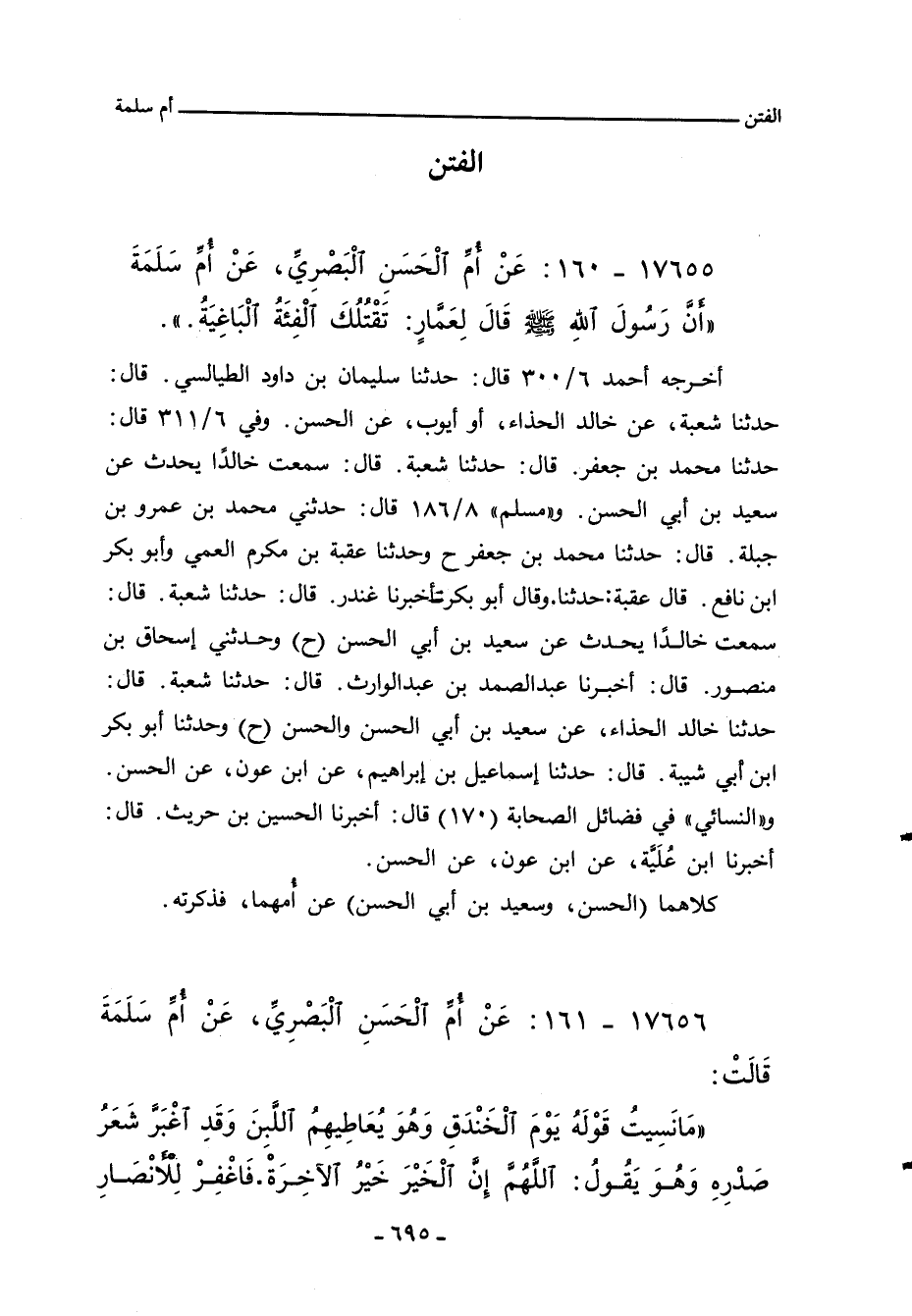 أخرجه أحمد ٦/ ٣٠٠ قال: حدثنا سليمان بن داود الطيالسي، قال: حدثنا شعبة، عن خالد الحذاء، او أيوب، عن الحسن. وفي ٦/ ٣١١ قال: حدثنا محمد بن جعفر، قال: حدثنا شعبة، قال: سمعت خالدًا يحدث عن سعيد بن أبي الحسن. و"مسلم" ٨/ ١٨٦ قال: حدثني محمد بن عمرو بن جبلة، قال: حدثنا محمد بن جعفر ح وحدثنا عقبة بن مكرم العمي وأبو بكر بن نافع، قال عقبة: حدثنا. وقال أبو بكر: أخبرنا غندر، قال: حدثنا شعبة، قال: سمعت خالدًا يحدث عن سعيد بن أبي الحسن (ح) وحدثني إسحاق بن منصور، قال: أخبرنا عبد الصمد بن عبد الوارث، قال: حدثنا شعبة، قال: حدثنا خالد الحذاء، عن سعيد بن أبي الحسن والحسن (ح) وحدثنا أبو بكر بن أبي شيبة، قال: حدثنا إسماعيل بن إبراهيم، عن ابن عون، عن الحسن. و"النَّسائي" في فضائل الصحابة (١٧٥) قال: أخبرنا الحسين بن حريث، قال: أخبرنا ابن عُلَيَّة، عن ابن عون، عن الحسن.