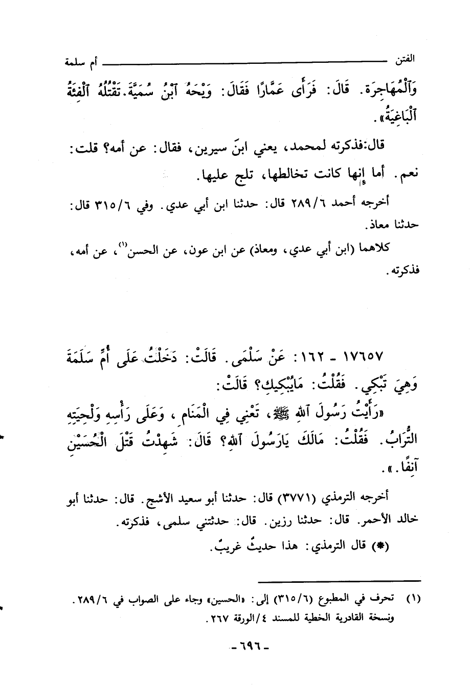 رَايْتُ رَسُولَ اللهِِ صلى الله عليه وسلم، تَعْنِي فِي الْمَنَامِ، وَعَلَى رَاْسِهِ وَلْحِيَتِهِ التُّرَابُ. فَقُلْتُ: مَالَكَ يَارَسُولَ اللهِِ؟ قَالَ: شَهِدْتُ قَتْلَ الْحُسَيْنِ انِفًا.