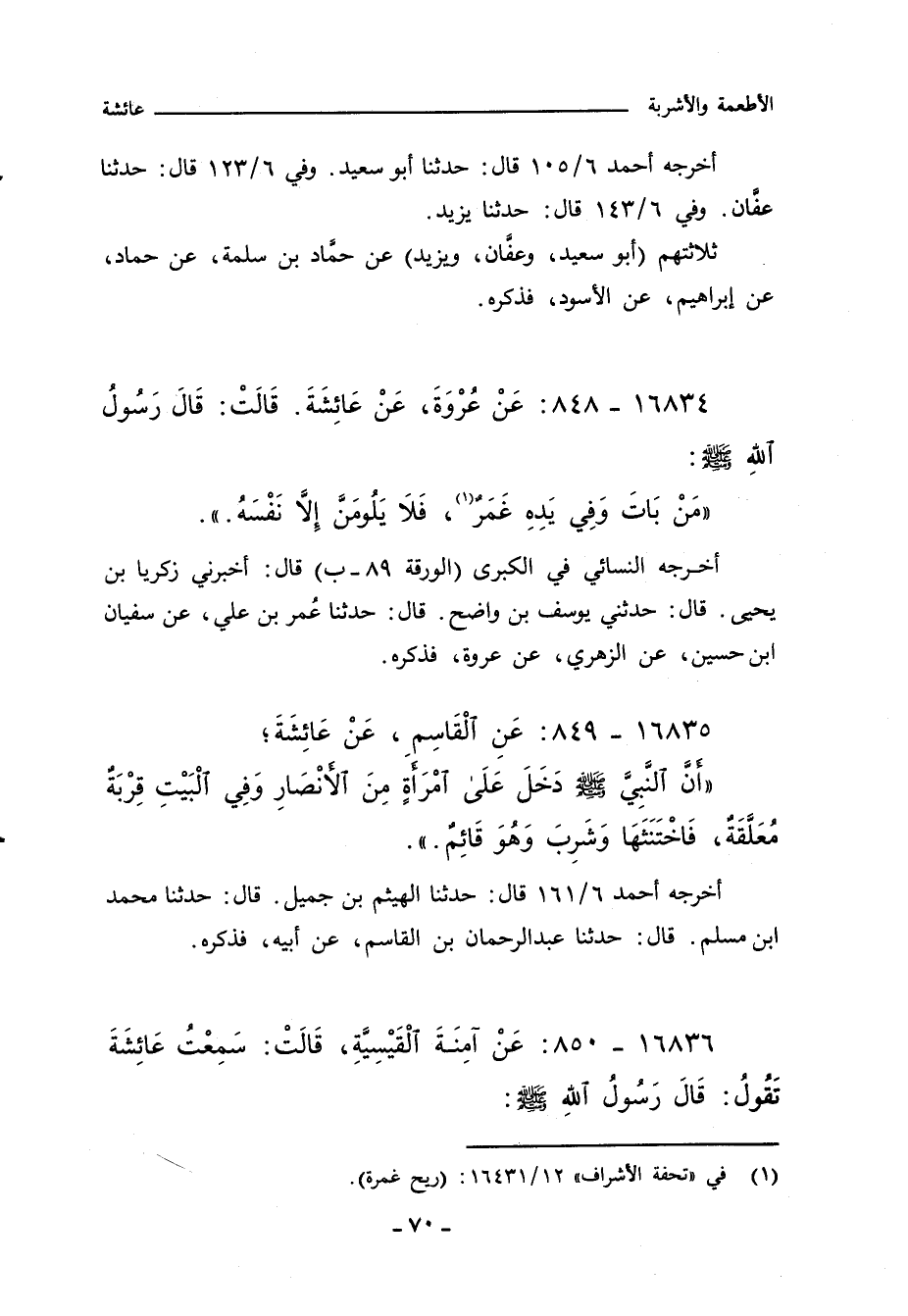 أخرجه أحمد ٦/ ١٦١ قال: حدثنا الهيثم بن جميل. قال: حدثنا محمد بن مسلم. قال: حدثنا عبد الرحمن بن القاسم، عن أبيه، فذكره.