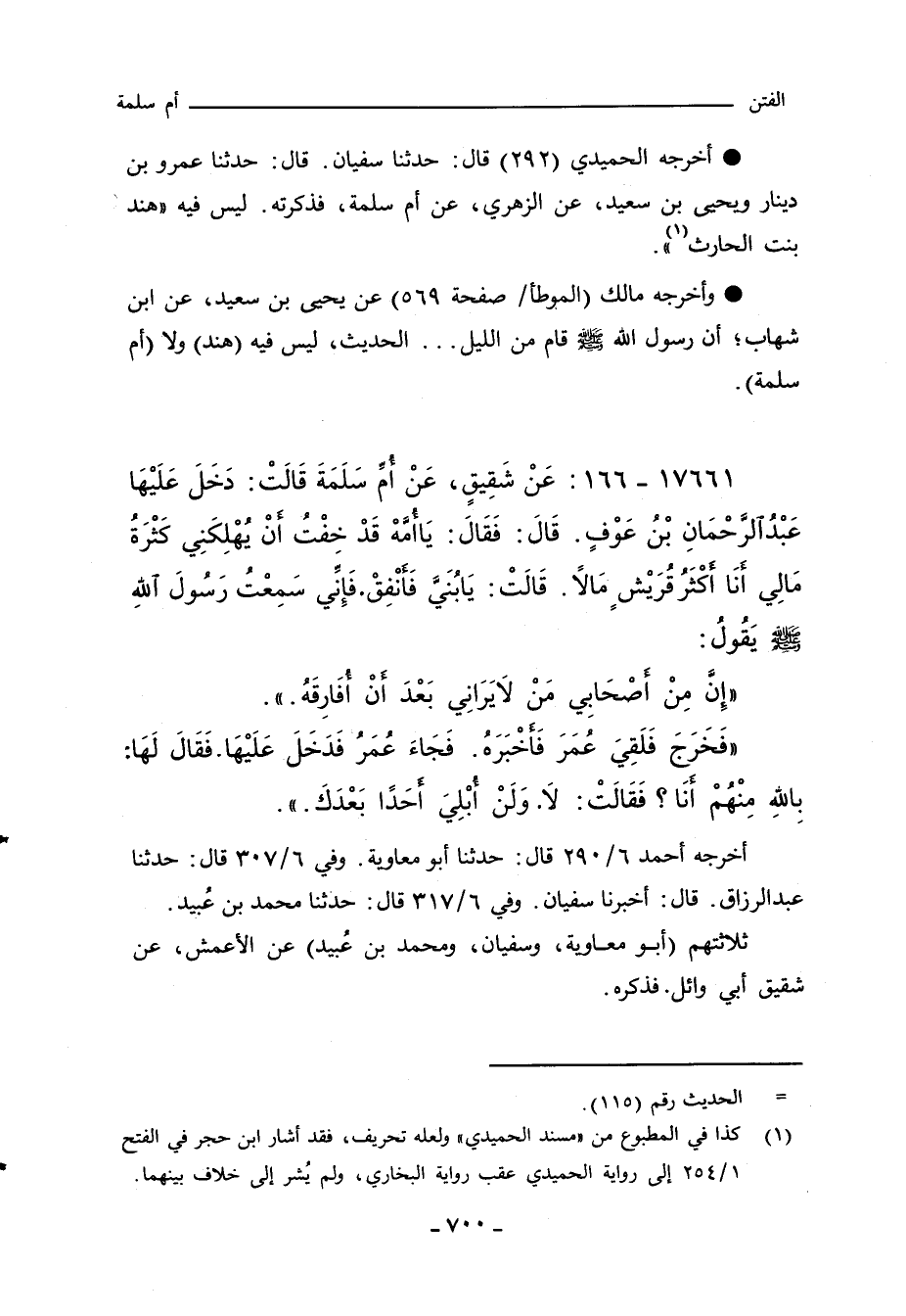 أخرجه الحميدي (٢٩٢) قال: حدثنا سفيان، قال: حدثنا عمرو بن دينار ويحيى بن سعيد، عن الزهري، عن أم سلمة، فذكرته. ليس فيه هند بنت الحارث.