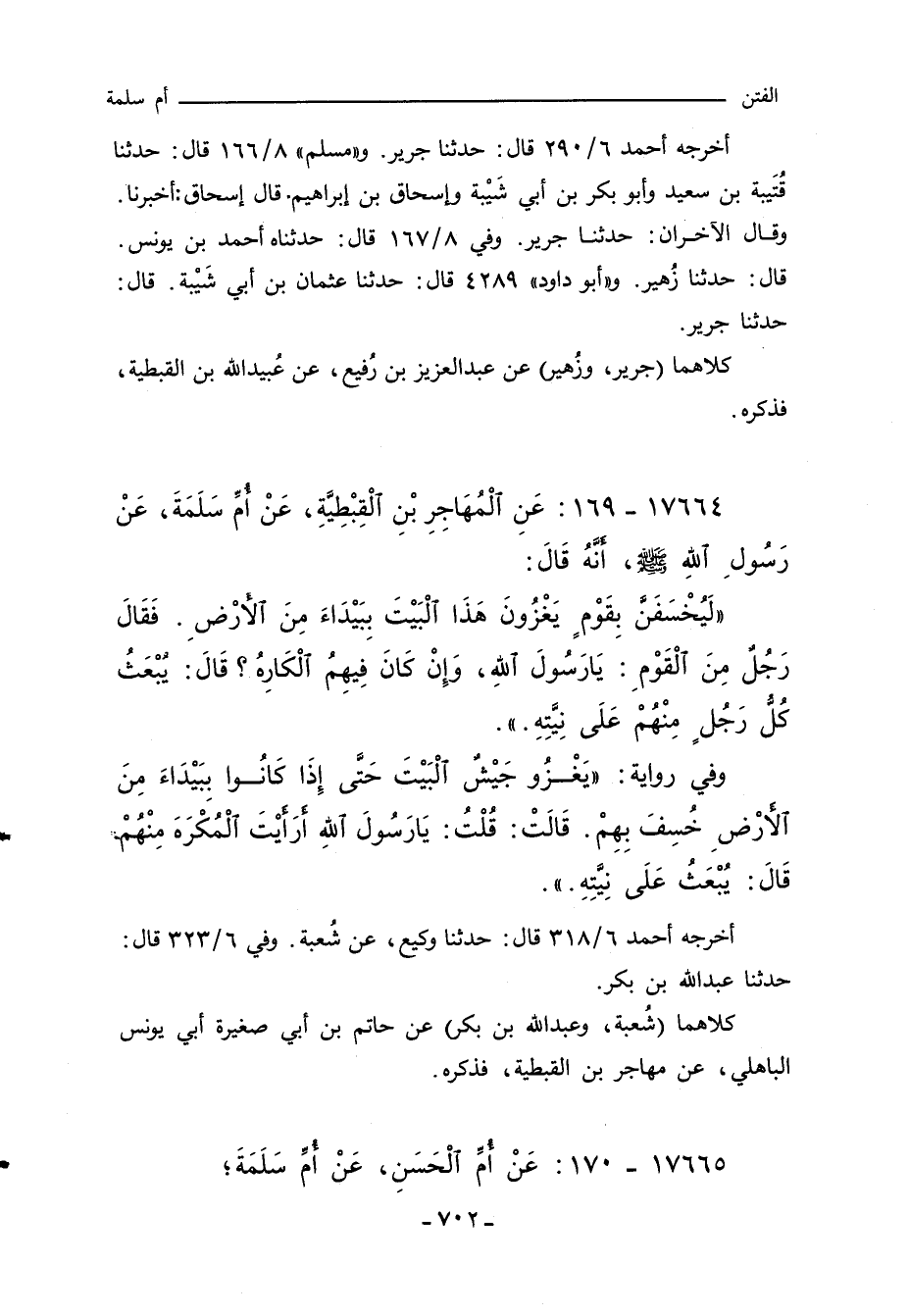 - وفي رواية: يَغْزُو جَيْشٌ الْبَيْتَ حَتَّى إِذَا كَانُوا بِبَيْدَاءَ مِنَ الارْضِ خُسِفَ بِهِمْ. قَالَتْ: قُلْتُ: يَا رَسُولَ اللهِِ ارَايْتَ الْمُكْرَهَ مِنْهُمْ، قال: يُبْعَثُ عَلَى نِيَّتِهِ.