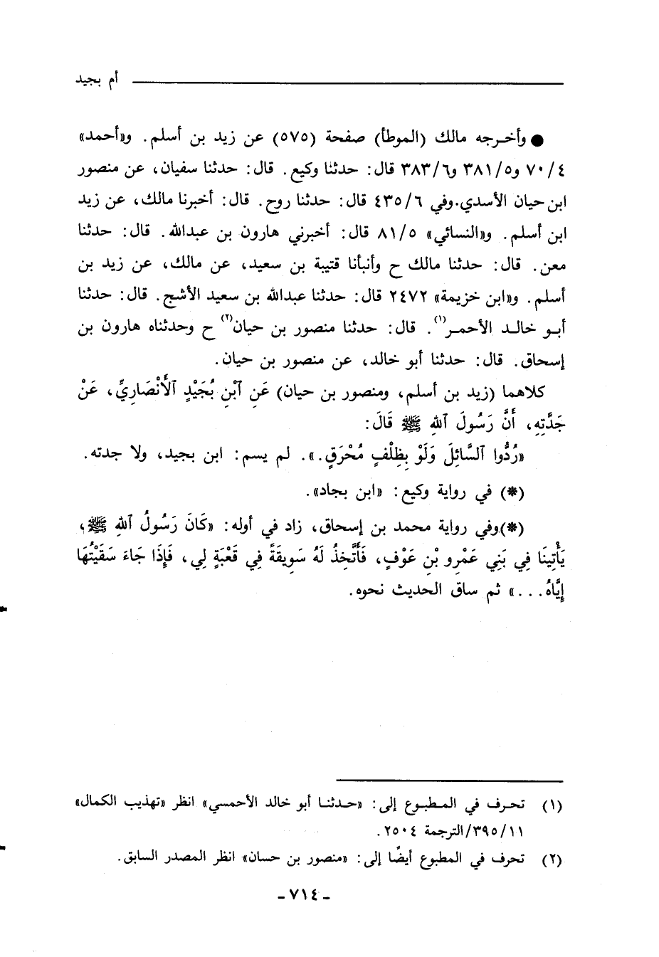 كلاهما (زيد بن اسلم، ومنصور بن حيان) عَنِ ابنِ بُجَيْدٍ الانْصَارِيِّ، عَنْ جَدَّتِهِ، انَ رَسُولَ اللهِِ صلى الله عليه وسلم قَالَ: