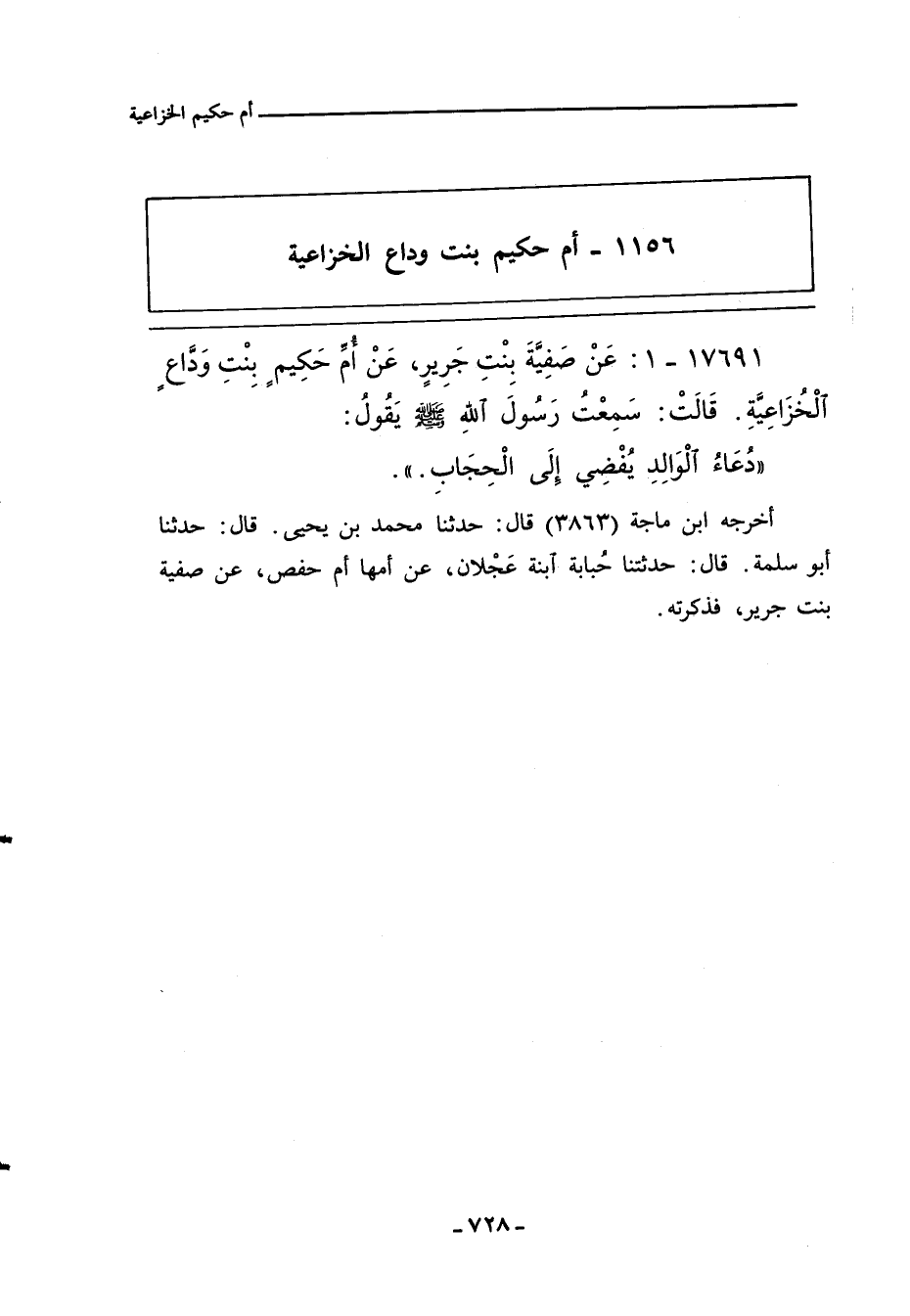 ١٧٦٩١ - عَنْ صَفِيَّةَ بِنْتِ جَرِيرٍ، عَنْ أم حَكِيمٍ بِنْتِ وَدَّاعٍ الْخُزَاعِيَّةِ. قَالَتْ: سَمِعْتُ رَسُولَ اللهِِ صلى الله عليه وسلم يَقُولُ: