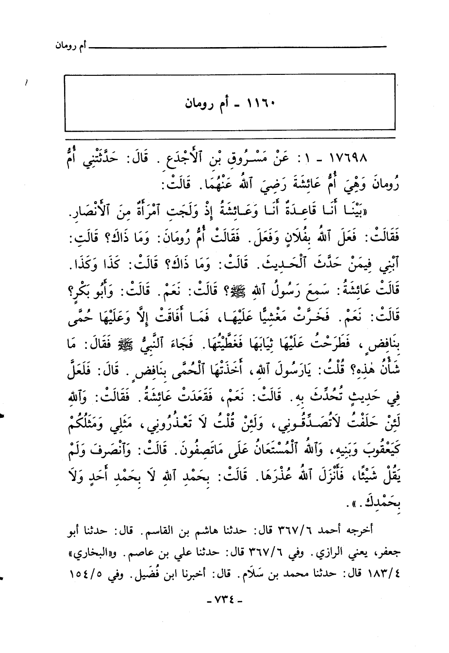 بَيْنَا انَا قَاعِدَةٌ انَا وَعَائِشَةُ إِذْ وَلَجَتِ امْرَاةٌ مِنَ الانْصَارِ. فَقَالَتْ: فَعَلَ اللَّهُ بِفُلانٍ وَفَعَلَ. فَقَالَتْ أم رُومَانَ: وَمَا ذَاكَ؟ قَالَتْ: ابْنِى فِيمَنْ حَدَّثَ الْحَدِيثَ. قَالَتْ: وَمَا ذَاكَ؟ قَالَتْ: كَذَا وَكَذَا. قَالَتْ عَائِشَةُ: سَمِعَ رَسُولُ اللهِِ صلى الله عليه وسلم؟ قَالَتْ: نَعَمْ. قَالَتْ: وَأبو بَكْرٍ؟ قَالَتْ: نَعَمْ. فَخَرَّتْ مَغْشِيًّا عَلَيْهَا، فَمَا افَاقَتْ إِلَاّ وَعَلَيْهَا حُمَّى بِنَافِضٍ، فَطَرَحْتُ عَلَيْهَا ثِيَابَهَا فَغَطَّيْتُهَا. فَجَاءَ النَّبِيَّ صلى الله عليه وسلم فَقَالَ: مَا شَاْنُ هَذِهِ؟ قُلْتُ: يَا رَسُولَ اللهِِ، اخَذَتْهُا الْحُمَّى بِنَافِضٍ، قال: فَلَعَلَّ فِى حَدِيثٍ تُحُدِّثَ بِهِ. قَالَتْ، نَعَمْ. فَقَعَدَتْ عَائِشَةُ. فَقَالَتْ: وَاللَّهِ لَئِنْ حَلَفْتُ لا تُصَدِّقُونِى، وَلَئِنْ قُلْتُ لا تَعْذِرُونِى، مَثَلِى وَمَثَلُكُمْ كَيَعْقُوبَ وَبَنِيهِ، وَاللَّهُ الْمُسْتَعَانُ عَلَى مَا تَصِفُونَ، قَالَتْ: وَانْصَرَفَ وَلَمْ يَقُلْ شَيْئًا، فَانْزَلَ اللَّهُ عُذْرَهَا. قَالَتْ: بِحَمْدِ اللهِ لا بِحَمْدِ احَدٍ وَلا بِحَمْدِكَ.