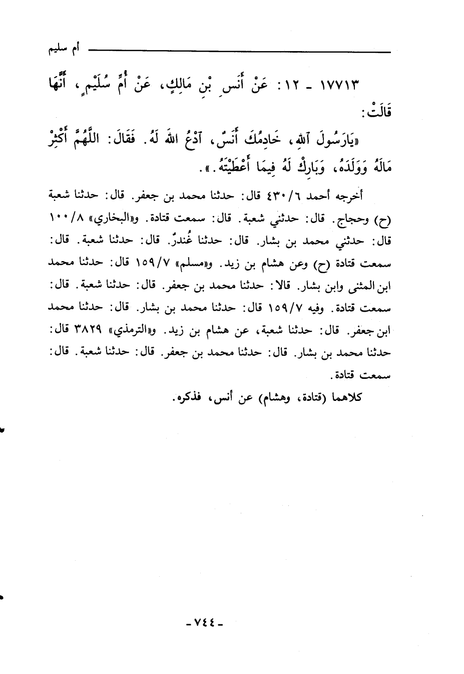 أخرجه أحمد ٦/ ٤٣٠ قال: حدثنا محمد بن جعفر، قال: حدثنا شعبة (ح) وحجاج، قال: حدثني شعبة، قال: سمعت قتادة. و"البُخَارِي" ٨/ ١٠٠ قال: حدثني محمد بن بشار، قال: حدثنا غُندرٌ، قال: حدثنا شعبة، قال: سمعت قتادة (ح) وعن هشام بن زيد. و"مسلم" ٧/ ١٥٩ قال: حدثنا محمد بن المثنى وابن بشار. قالا: حدثنا محمد بن جعفر، قال: حدثنا شعبة، قال: سمعت قتادة. وفيه ٧/ ١٥٩ قال: حدثنا محمد بن بشار، قال: حدثنا محمد ابن جعفر، قال: حدثنا شعبة، عن هشام بن زيد. و"التِّرمِذي" ٣٨٢٩ قال: حدثنا محمد بن بشار، قال: حدثنا محمد بن جعفر، قال: حدثنا شعبة، قال: سمعت قتادة.