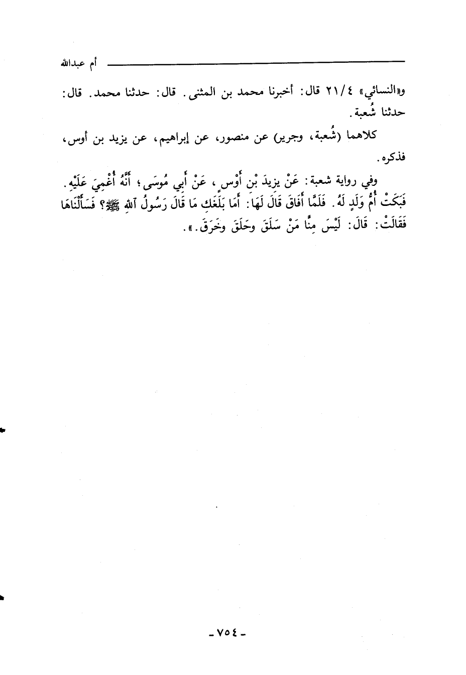 كلاهما (شُعبه، وجرير) عن منصور، عن إبراهيم، عن يزيد بن اوس، فذكره. وفي رواية شعبه: عَنْ يزِيدَ بْنِ اوْسٍ، عَنْ أبي موسَى؛ انَّهُ اُغْمِيَ عَليْهِ. فَبَكَتْ أم وَلَدٍ لَهُ. فَلَمَّا افَاقَ قَالَ لَهَا: امَا بَلَغَكِ مَاقَالَ رَسُولُ اللهِِ صلى الله عليه وسلم؟ فَسَالْنَاهَا فَقَالَتْ: قَالَ: لَيْسَ مِنَّا مَنْ سَلَقَ وحَلَقَ وخَرَقَ.