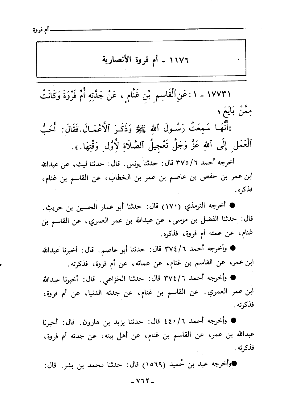 - أخرجه الترمذي (١٧٠) قال: حدثنا أبو عمار الحسين بن حريث، قال: حدثنا الفضل بن موسى، عن عبد الله بن عمر العمري، عن القاسم بن غنام، عن عمته أم فروة، فذكره.