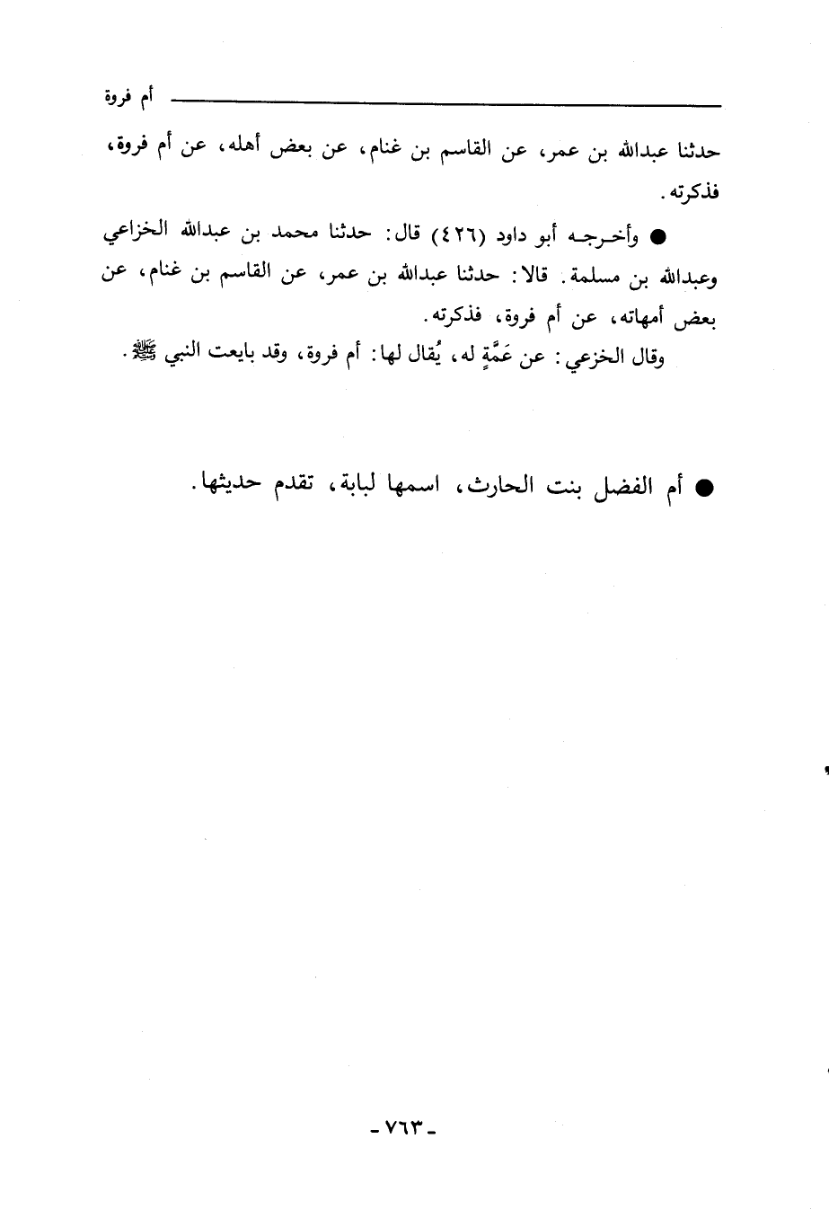 - وأخرجه أبو داود (٤٢٦) قال: حدثنا محمد بن عبد الله الخزاعي وعبد الله بن مسلمة. قالا: حدثنا عبد الله بن عمر، عن القاسم بن غنام، عن بعض امهاته، عن أم فروة، فذكرته.
