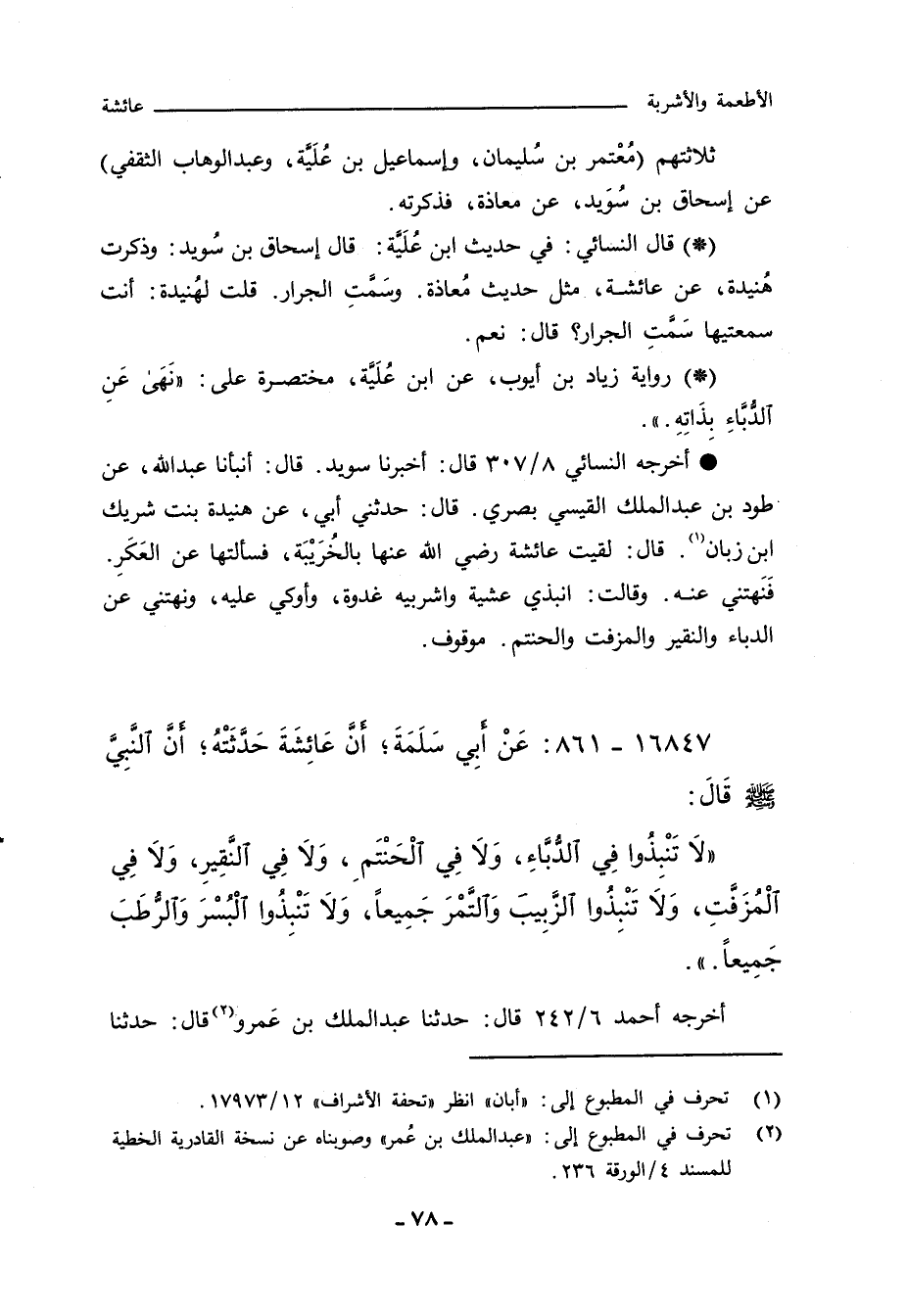 - قال النسائي: في حديث ابن عُلَيَّة: قال إسحاق بن سُويد: وذكرت هُنيدة، عن عائشة، مثل حديث مُعاذة. وسَمَّتِ الجرار. قلت لهُنيدة: انت سمعتيها سَمَّتِ الجرار؟ قال: نعم.