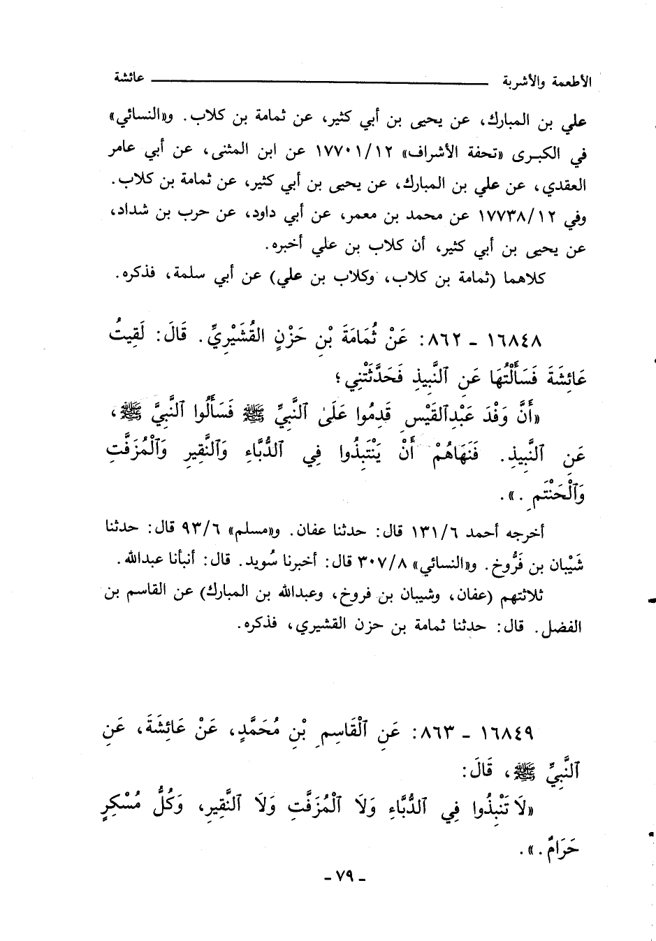 ١٦٨٤٨ - عَنْ ثُمَامَةَ بْنِ حَزْنٍ القُشَيْرِيِّ. قَالَ: لَقِيتُ عَاثِشَةَ فَسَالْتُهَا عَنِ النَّبِيذِ فَحَدَّثَتْنِي؛