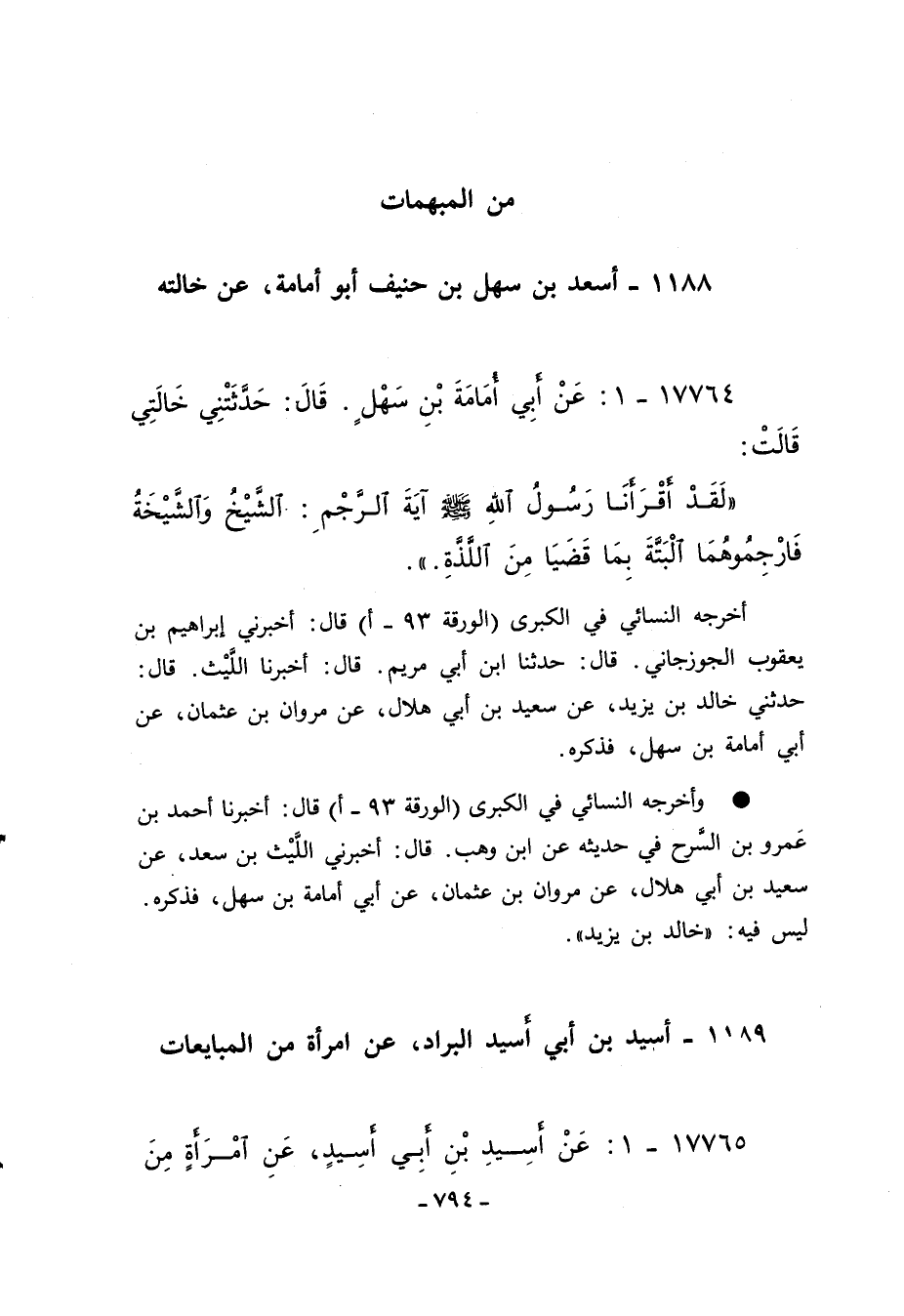 - وأخرجه النسائي في "الكبرى" (الورقة ٩٣ - ا) قال: أخبرنا أحمد بن عَمرو بن السَّرح في حديثه عن ابن وهب، قال: أخبرني اللَّيْث بن سعد، عن سعيد بن أبي هلال، عن مروان بن عثمان، عن أبي امامة بن سهل، فذكره. ليس فيه: خالد بن يزيد.