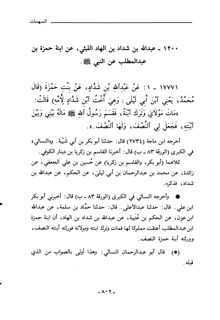 ١٢٠٠ - عبد اللهِ بن شداد بن الهاد الليثي عن ابنة حمزة بن عبد المطلب عن النبي صلى الله عليه وسلم