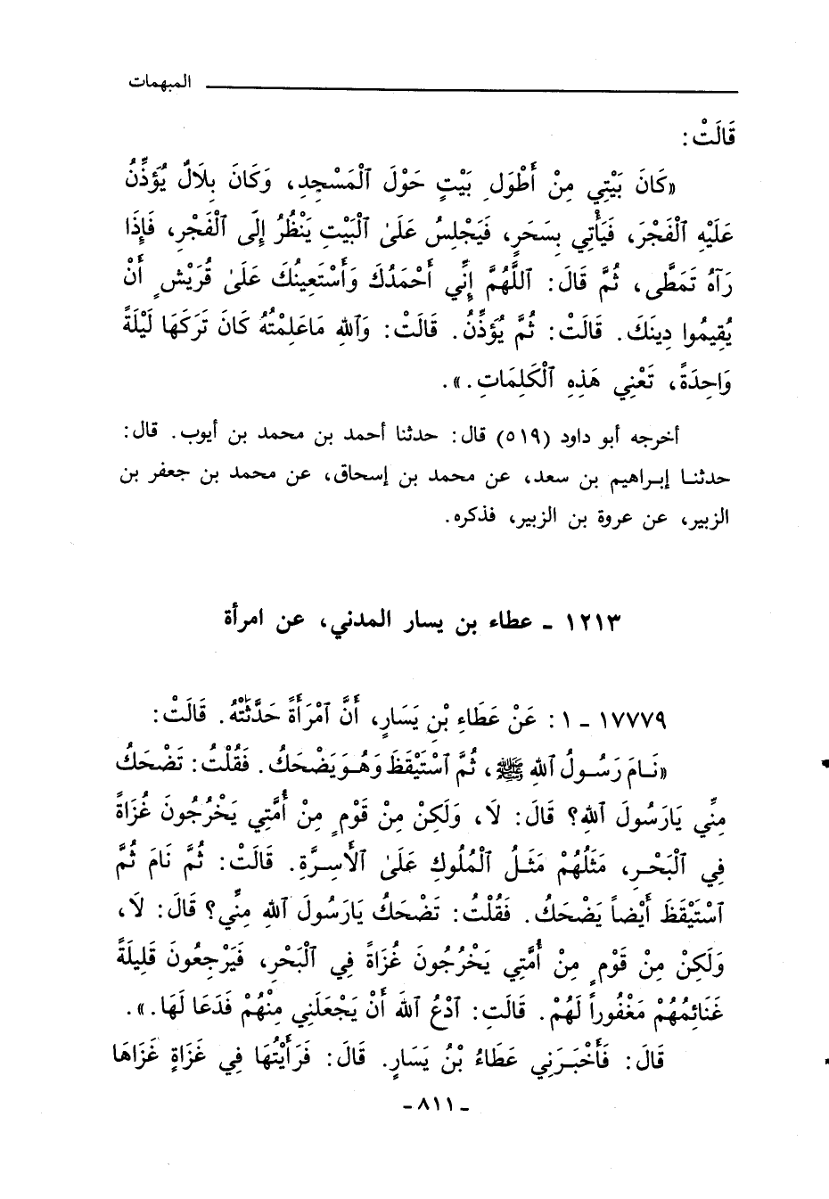 كَانَ بَيْتِي مِنْ اطْوَلِ بَيْتٍ حَوْلَ الْمَسْجِدِ، وَكَانَ بِلالُ يُؤَذِّنُ عَلَيْهِ الْفَجْرَ، فَيَاتِي بِسَحَرٍ، فَيَجْلِسُ عَلَى الْبَيْتِ يَنْظُرُ إِلَى الْفَجْرِ، فَإِذَا رَاهُ تَمَطَّى، ثُمَّ قَالَ: اللَّهُمَّ إِنِّي احْمَدُكَ وَاسْتَعِينُكَ عَلَى قُرَيْشٍ أَنْ يُقِيمُوا دِينَكَ. قَالَتْ: ثًمَّ يُؤَذِّنُ. قَالَتْ: وَاللَّهِ مَاعَلِمْتُهُ كَانَ تَرَكَهَا لَيْلَةً وَاحِدَةً، تَعْنِي هَذِهِ الْكَلِمَاتِ.