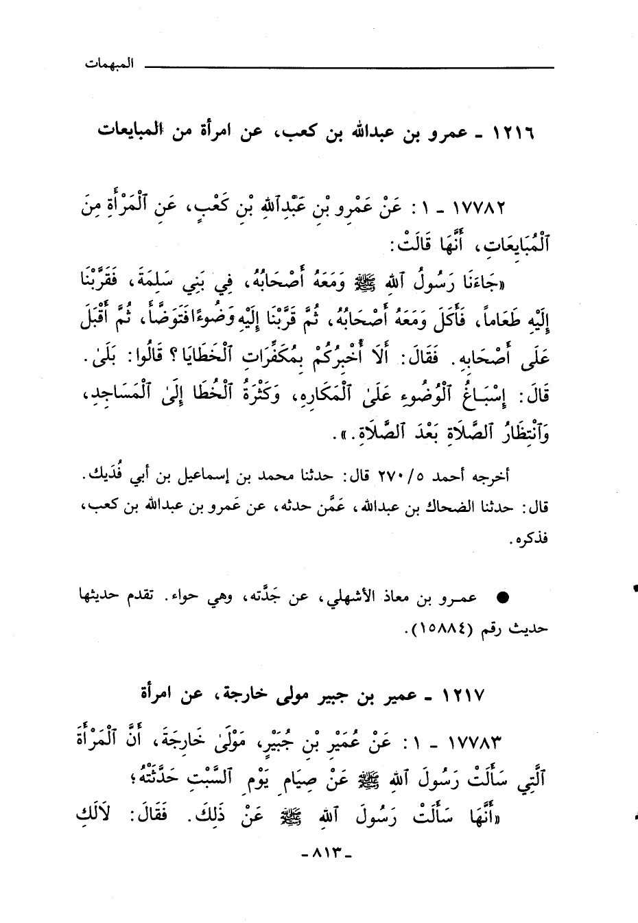 - عمرو بن معاذ الاشهلي، عن جَدًته، وهي حواء. تقدم حديثها حديث رقم (١٥٨٨٤.