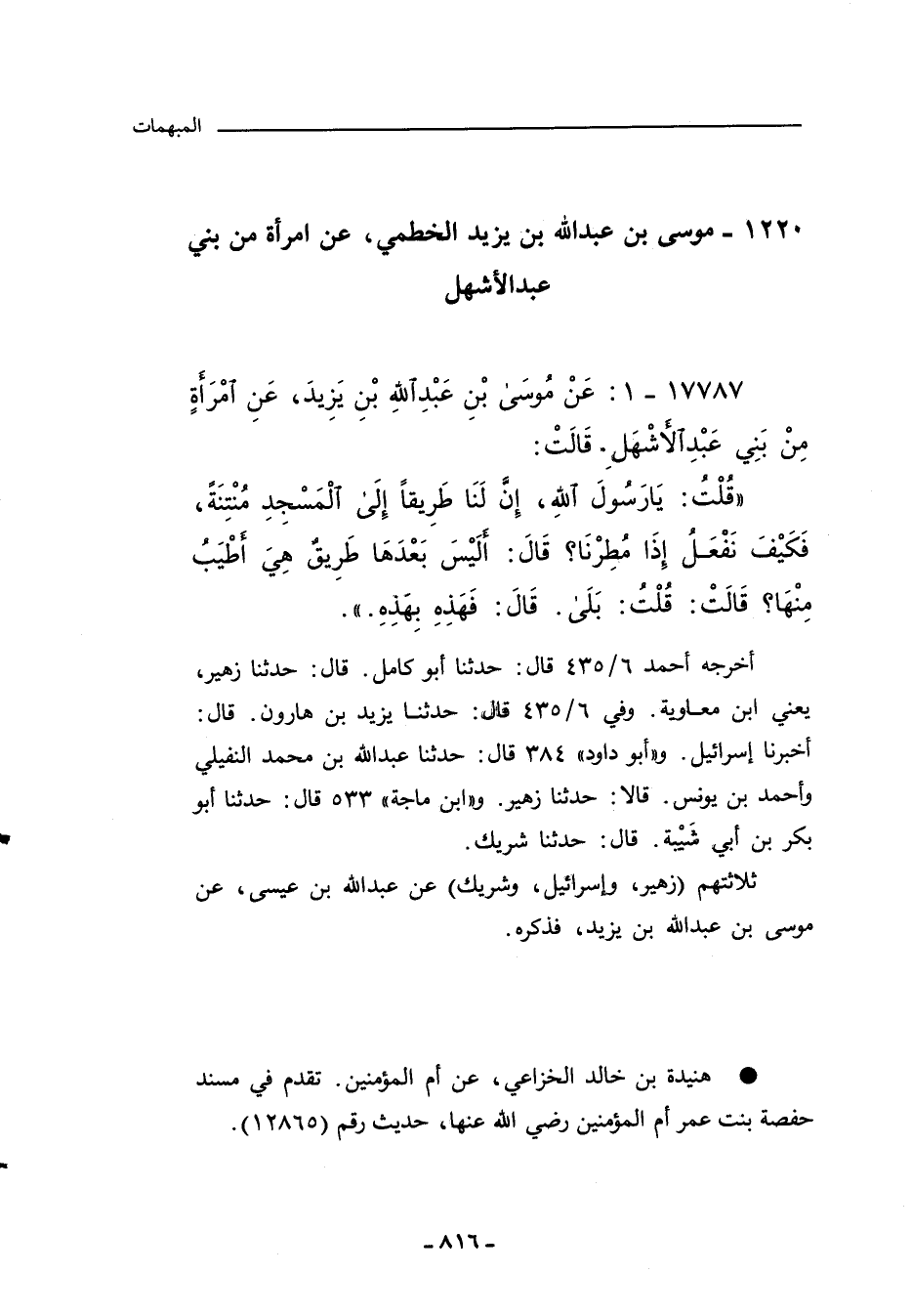قُلْتُ: يَارَسُولَ اللهِِ، إِنَّ لَنَا طَرِيقًا إِلَى الْمَسْجِدِ مُنْتِنَةً، فَكَيْفَ نَفْعَلُ إِذَا مُطِرْنَا؟ قَالَ: الَيْسَ بَعْدَهَا طَرِيقٌ هِيَ اطْيَبُ مِنْهَا؟ قَالَتْ: قُلْتُ: بَلَى، قال: فَهَذِهِ بِهَذِهِ.