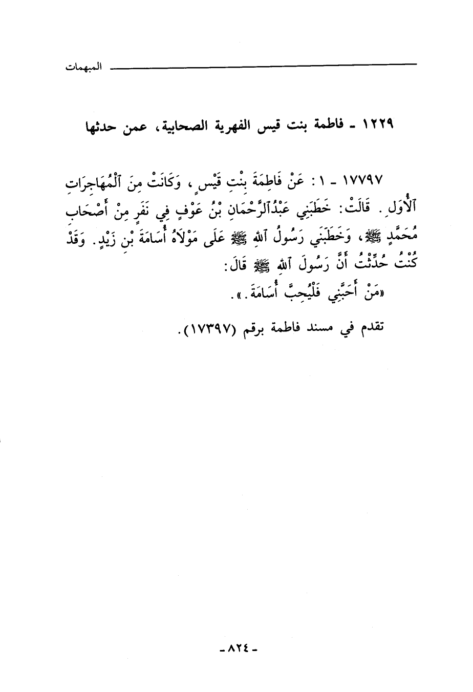 ١٧٧٩٧ - عَنْ فَاطِمَةَ بِنْتِ قَيْسٍ، وَكَانَتْ مِنَ الْمُهَاجِرَاتِ الاُوَلِ. قَالَتْ: خَطَبَنِي عَبْدِ الرَّحْمانِ بْنُ عَوْفٍ فِي نَفَرٍ مِنْ اصْحَابِ مُحَمَّدٍ صلى الله عليه وسلم، وَخَطَبَنَي رَسُولُ اللهِِ صلى الله عليه وسلم عَلَى مَوْلاهُ أُسامة بْنِ زَيْدٍ. وَقَدْ كُنْتُ حُدِّثْتُ أَنَّ رَسُولَ اللهِِ صلى الله عليه وسلم قَالَ: