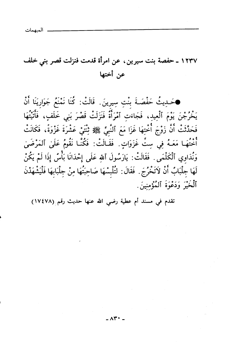 - حَدِيثُ حَفْصَةَ بِنْتِ سِيرينَ. قَالَتْ: كُنَا نَمْنَعُ جَوَارِيَنَا أَنْ يَخْرُجْنَ يَوْمَ الْعِيدِ، فَجَاءَتِ امْرَاةٌ فَنَزَلَتْ قَصْرَ بَنِي خَلَفٍ، فَاتَيْتُهَا فَحَدَّثَتْ، أَنَّ زَوْجَ أختها غَزَا مَعَ النَّبِيِّ صلى الله عليه وسلم ثِنْتَيْ عَشْرَةَ غَزْوَةً، فَكَانَتْ أختها مَعَهُ فِي سِتِّ غَزَوَاتٍ. فَقَالَتْ: فَكُنَّا نَقُومُ عَلَى المَرْضَى وُندَاوِي الْكَلْمَى. فَقَالَتْ: يَارَسُولَ اللهِِ عَلَى إِحْدَانَا بَاْسٌ إِذَا لَمْ يَكُنْ لَهَا جِلْبَابٌ أَنْ لاتَخْرُجَ. فَقَالَ: لتُلْبِسْهَا صَاحِبَتُهَا مِنْ جِلْبَابِهَا فَلْيَشْهَدْنَ الْخَيْرَ وَدَعْوَةَ المُؤْمِنِينَ.