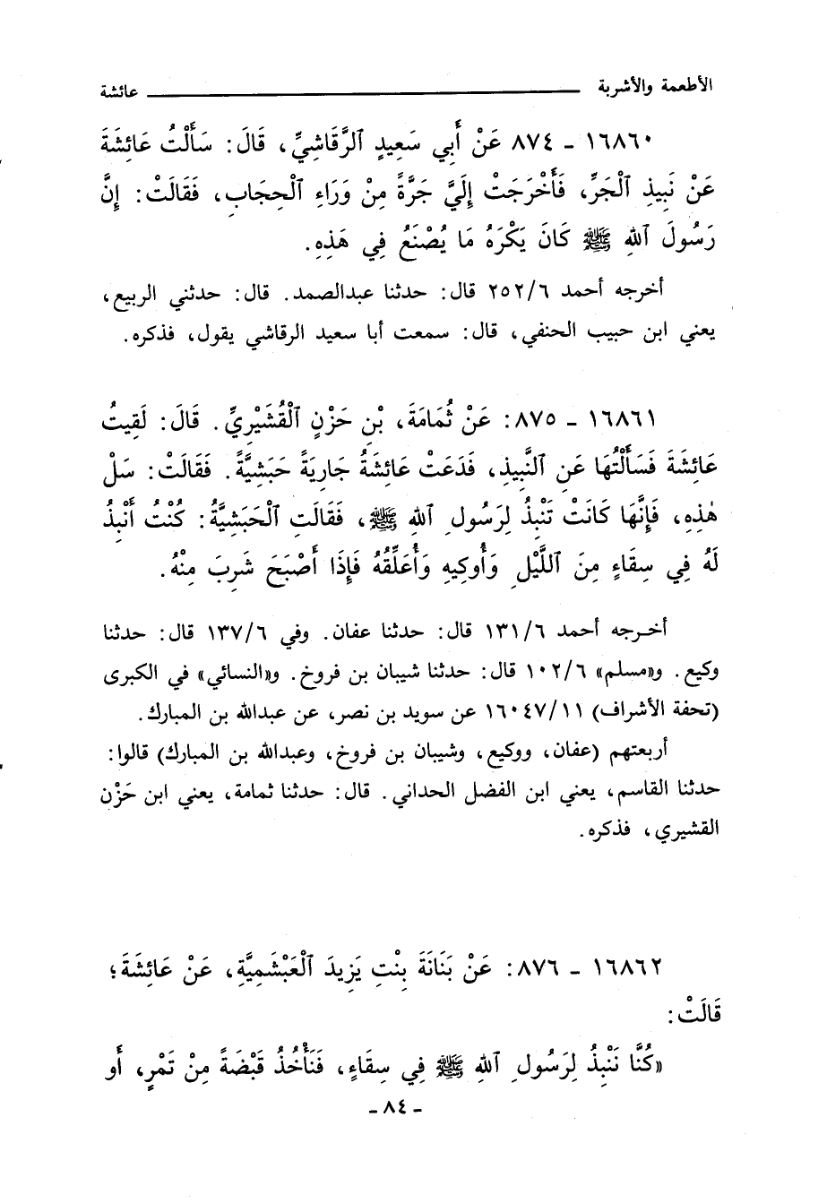 ١٦٨٦١ - عَنْ ثُمَامَةُ بْنُ حَزْنٍ الْقُشَيْرِىُّ قَالَ سَأَلْتُ عَائِشَةَ عَنِ النَّبِيذِ فَقَالَتْ قَدِمَ وَفْدُ عَبْدِ الْقَيْسِ عَلَى رَسُولِ اللَّهِ صلى الله عليه وسلم فَنَهَاهُمْ أَنْ يَنْتَبِذُوا فِى الدُّبَّاءِ وَالنَّقِيرِ وَالْمُقَيَّرِ وَالْحَنْتَمِ. وَدَعَتْ جَارِيَةً حَبَشِيَّةً فَقَالَتْ لِى سَلْ هَذِهِ فَإِنَّهَا كَانَتْ تَنْبِذُ لِرَسُولِ اللَّهِ صلى الله عليه وسلم قَالَتْ كُنْتُ أَنْتَبِذُ لِرَسُولِ اللَّهِ صلى الله عليه وسلم فِى سِقَاءٍ مِنَ اللَّيْلِ أُوكِئُهُ وَأُعَلِّقُهُ فَإِذَا أَصْبَحَ شَرِبَ مِنْهُ.