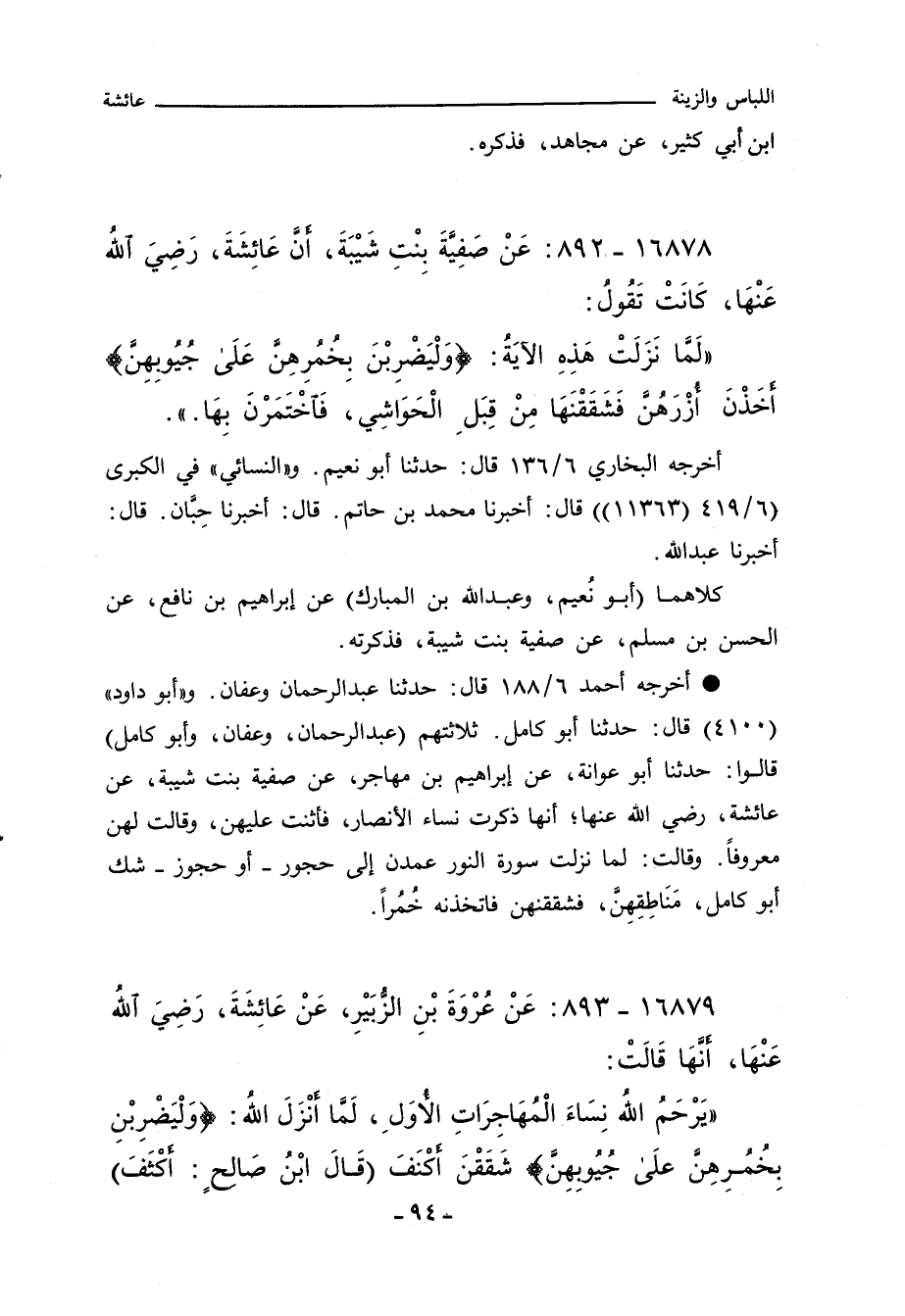 ثلاثتهم (عبد الرحمن، وعفان، وأبو كامل) قالوا: حدثنا أبو عوانة، عن إبراهيم بن مهاجر، عن صفية بنت شيبة، عن عائشة، رضي الله عنها؛ أنها ذكرت نساء الأنصار، فأثنت عليهن، وقالت لهن معروفا. وقالت: لما نزلت سورة النور عمدن إلى حجور - أو حجوز - شك أبو كامل، مَنَاطِقِهِنَ، فشققنهن فاتخذنه خُمُرا.
