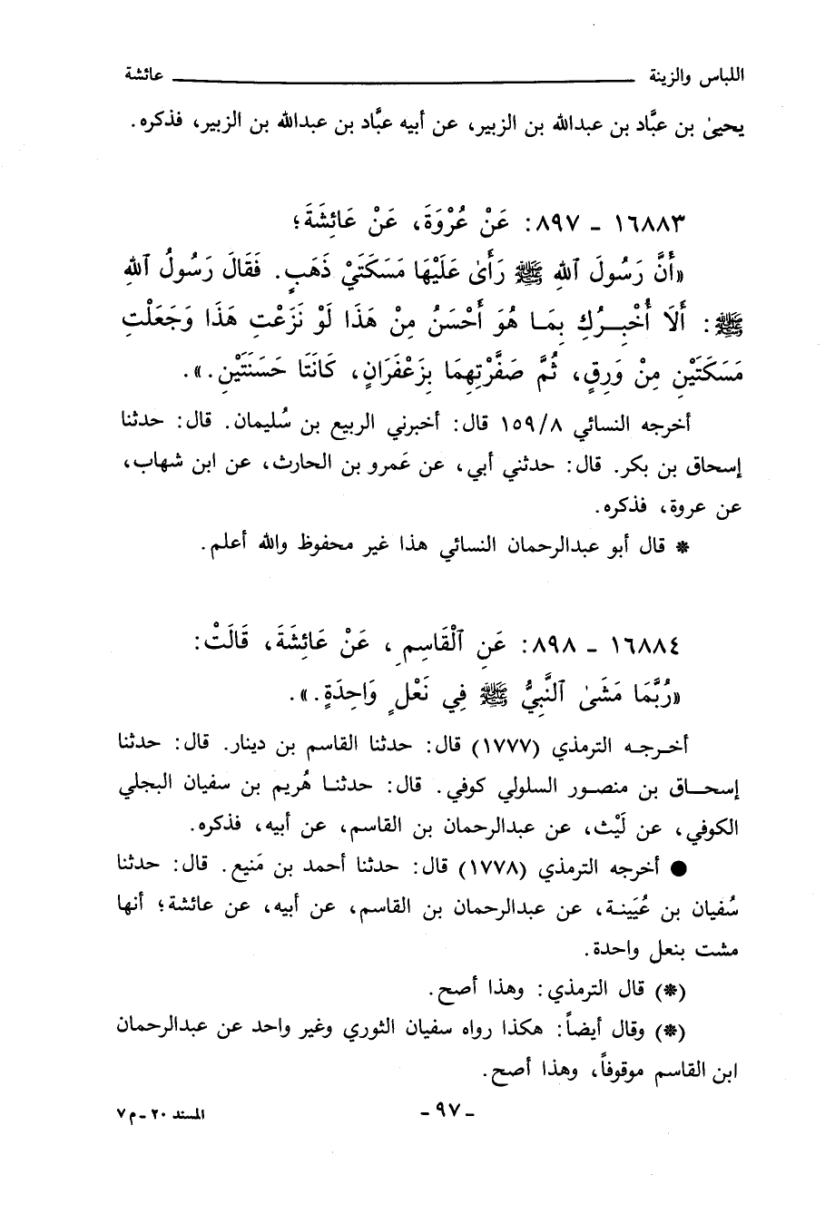 - أخرجه الترمذي (١٧٧٨) قال: حدثنا أحمد بن مَنيع. قال: حدثنا سُفيان بن عُيَينة، عن عبد الرحمن بن القاسم، عن أبيه، عن عائشة؛ أنها مشت بنعل واحدة.