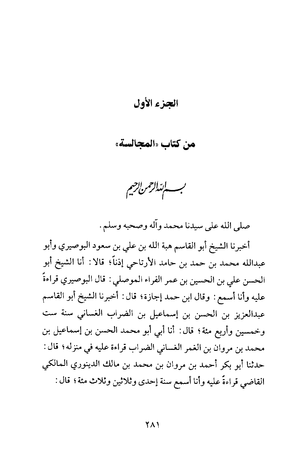 أخبرنا الشيخ أبو القاسم هبة الله بن علي بن سعود البوصيري وأبو عبد الله محمد بن حمد بن حامد الأرتاحي إذناً؛ قالا: أنا الشيخ أبو الحسن علي بن الحسين بن عمر الفراء الموصلي، قال البوصيري: قراءةً عليه وأنا أسمع، وقال ابن محمد: إجازة؛ قال: أخبرنا الشيخ أبو القاسم عبد العزيز بن الحسن بن إسماعيل بن الضراب الغساني سنة ست وخمسين وأربع مئة؛ قال: أنا أبي أبو محمد الحسن بن إسماعيل بن محمد بن مروان بن الغمر الغساني الضراب قراءة عليه في منزله؛ قال: حدثنا أبو بكر أحمد بن مروان بن محمد بن مالك الدينوري المالكي القاضي قراءةً عليه وأنا أسمع سنة إحدى وثلاثين وثلاث مئة؛ قال: -[282]- الحمد لله الذي علا بكل مكرمة، وبان بكل فضيلة، وبطن بخفيات الأمور، ودلت عليه أعلام الظهور، واستتر بلطفه عن عين البصير؛ فلا نفس من لا تراه تنكره، ولا عين من أثبتته تبصره، بسق في العلو؛ فلا شيء أعلا منه، وسقب في الدنو؛ فلا شيء أقربُ منه، ولا استعلاءه باعده من خلقه، ولا قربهُ ساواهم في المكان معه، لم تطلع العقول على تحديد صفته، ولم يحجبها عن كنه معرفته، لا يعزبُ عنه شيء، ولا تحجب عنه دعوة؛ ولا تَخيب لديه طلبة، ولا يضل عنده سعيُ الذي رضي عن عظيم النِّعم بقليل الشكر، وغفر بعقد الندم كثير الذنوب، ومحا بتوبة الساعة خطايا الزمان والدهور؛ فتعالى الله عما يقول الجاحدون له والملحدون في توحيده علوّاً كبيراً، لم يلد ولم يولد ولم يكن له كفواً أحد؛ نحمده، ونستعينه، ونؤمن به، ونتوكل عليه، ونشهد أن لا إله إلا الله وحده لا شريك له، وأن محمداً عبده ورسوله؛ البشير، النذير، السراج المنير، المنتخب في علم الغيوب، والمصطفى في اللوح المحفوظ وعلم ما جرت به المقادير؛ فإنه المباعد من الرجس بالتطهير، مع سؤدد البشر وطيب المختبر وشرف المعشر من أهل المعشر؛ حتى بدا صَلَّى اللَّهُ عَلَيْهِ وَسَلَّمَ في خير قريش بطناً، وأنضرها عوداً، وأطولها باعاً، وأسفرها قناعاً، وأثبتها في مُرتقى الخير سلماً، هادياً إلى رضاه، وداعياً إلى محابِّه، ودالاً على سبيل جنته، فتح لنا باب رحمته، وأغلق عنا باب سخطه، وبلَّغ الرسالة، وأدى الأمانة، وجاهد في الله عز وجل حتى أتاه اليقين؛ فصلوات الله عليه ورحمته وبركاته وعلى آله، وسلم كثيراً أبداً ما طمى بحرٌ وذرَّ ريح، وعلى -[283]- جميع النبيين والمرسلين. أما بعد: فإن الله تبارك وتعالى في كل نعمة أنعم بها حقاً على عباده يجب عليهم الشكر له؛ فنسأل الله أن يجعلنا لنعمه شاكرين، وبأحسنه آخذين، وأن ينفعنا بالعلم؛ فإن خير العلوم أنفعُها، وأنفعُها أحمدُها مَغَبَّة، وأحمدها مَغَبَّة ما تُعُلِّم وعُلِّمَ لله تبارك وتعالى وأريد به وجهه، ونحن نسأل الله أن يجعلنا بما علمنا عاملين، وبأحسنه آخذين، ولوجهه الكريم بما يستفيد ويفيد وبحسن بلائه عندنا وبشكره آناء الليل والنهار عارفين، إنه أقربُ المدعوين، وأفضلُ المعطين، وأجودُ المسؤولين. وإني تكلَّفت بهذا الكتاب وجمعت فيه علوماً كثيرة؛ من التفسير ومعاني القرآن، وفي عظمة الله جلّ وعزّ، ومن حديث الرسول صَلَّى اللَّهُ عَلَيْهِ وَسَلَّمَ وحديث الصحابة وأخبارهم؛ رحمة الله عليهم أجمعين، ومن حديث أخبار التابعين والزهاد والعلماء والحكماء والشعر والنوادر وأخبار العرب وأيامها وأخبار الفرس وغير ذلك من فنون العلم، ولم أدع شيئاً يحتاج إليه العالم والمتعلم ويجري ذكره في مجالسهم؛ إلا وقد ذكرت في كتابي هذا منه طرفاً، وجعلته مختصراً كيلا يثقل على من كتبه، ويكون ذلك سهلاً على من نظر فيه وحفظه. ونسأل الله عز وجل التجاوز عن الزَّلَّة، وحسن التوفيق لما يحب؛ إنه خير مسؤول، وأفضل مأمول.