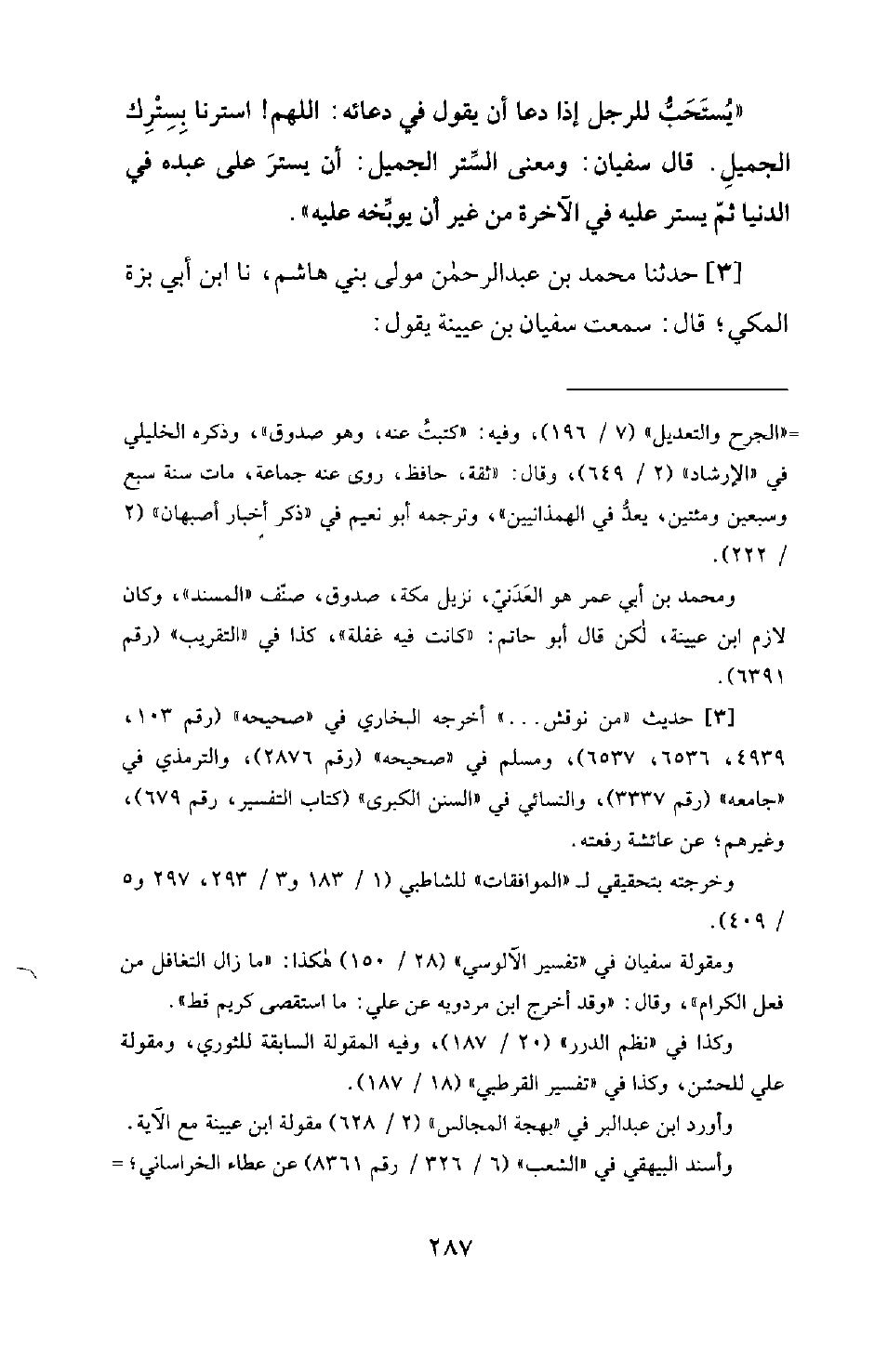 3 - حَدَّثَنَا مُحَمَّدُ بْنُ عَبْدِ الرَّحْمَنِ مَوْلَى بَنِي هَاشِمٍ، نَا ابْنُ أَبِي بَزَّةَ الْمَكِّيُّ؛ قَالَ: سَمِعْتُ سُفْيَانَ بْنَ عُيَيْنَةَ يَقُولُ: -[288]- مَعْنَى قَوْلِ النَّبِيِّ صَلَّى اللَّهُ عَلَيْهِ وَسَلَّمَ: «مَنْ نُوقِشَ الْحِسَابَ عُذِّبَ» قَالَ سُفْيَانُ: وَالنَّقْشُ هُوَ الاسْتِقْصَاءُ حَتَّى لَا يَتْرُكَ منه شيء. قَالَ: ثُمَّ الْتَفَتَ إِلَيْنَا سُفْيَانُ، فَقَالَ: أَبْشِرُوا؛ فَإِنَّهُ مَا اسْتَقْصَى كَرِيمٌ حَقَّهُ قَطُّ، أَمَا سَمِعْتَ قَوْلَهُ عَزَّ وَجَلَّ: {وَإِذْ أَسَرَّ النَّبِيُّ إِلَى بَعْضِ أَزْوَاجِهِ حَدِيثًا} إِلَى قَوْلِهِ عَزَّ وَجَلَّ: {عَرَّفَ بَعْضَهُ وَأَعْرَضَ عن بعض} [التحريم: 3] ؛ فَاللهُ تَبَارَكَ أَكْرَمُ الْأَكْرَمِينَ.